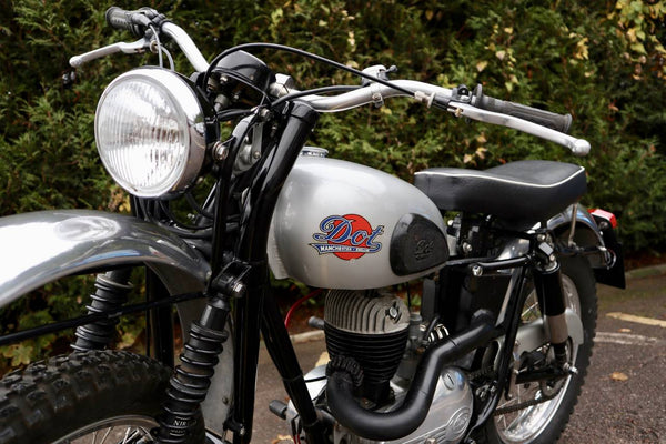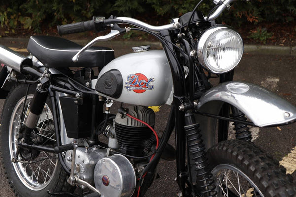 1954 DOT TDHX4P 197cc Two Stroke Trials Bike. This is a very rare bike with only 2 known to be registered in the UK. TDHX4P stands for: T = Trials - D = Direct Lighting - H = Hydraulic rear suspension - X = 21 Front wheel - 4 = 4 speed gearbox - P = Pivoting front forks known as Earles forks. This engine is a Villiers 8E/4 197cc motor. Manufactured on the 23.04.1954 where it was then sent to Meetens Motor Mecca Dealership in New Malden, Surrey.