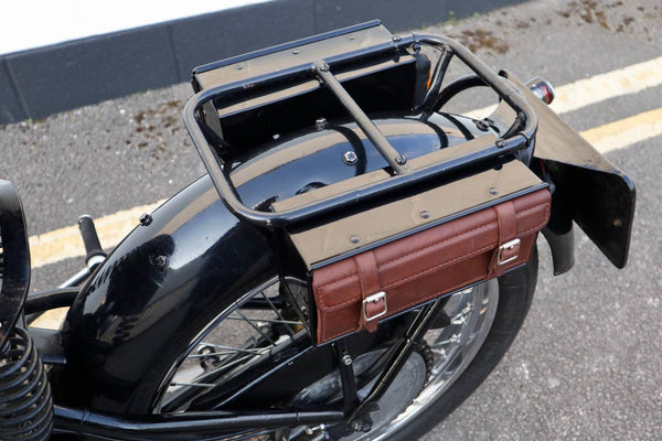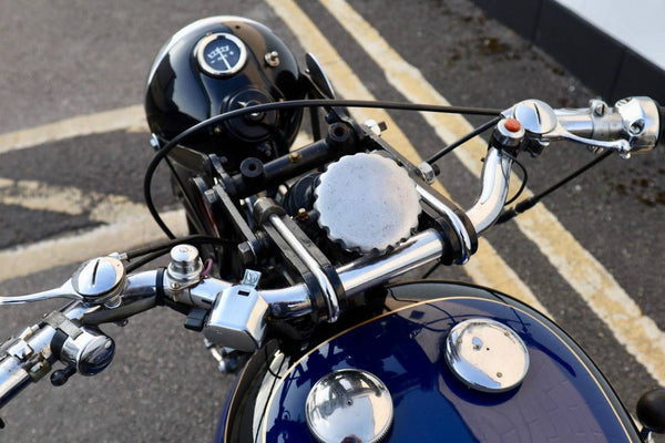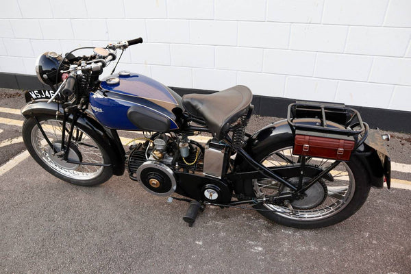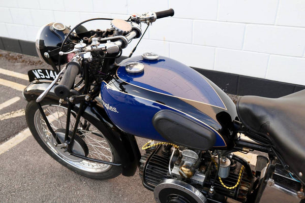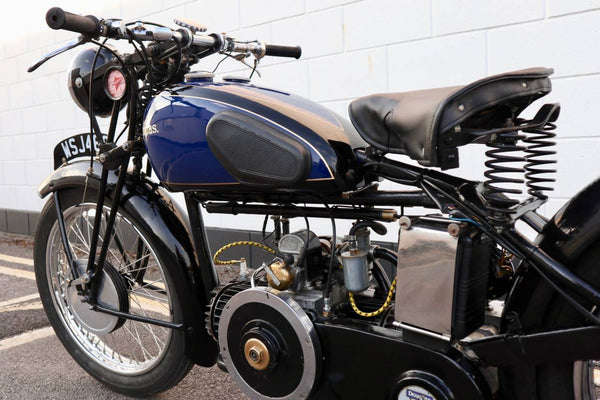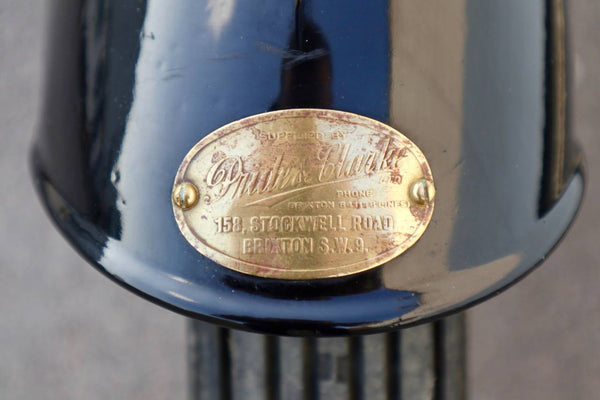 All control cables, inner and outer are new. It has an led stop/tail light bulb. All lights are working. BTH dynamo works. Battery is nearly new. Girder fork spindles and nuts were new in January 2021. Throttle twist grip assembly was new April 2021. It has an original (working) Douglas tyre inflator. All four gears select and change up and down easily. Tyres are good with 4mm front and 7mm rear tread. It has its Pride & Clarke suppliers brass plate on the front mudguard.