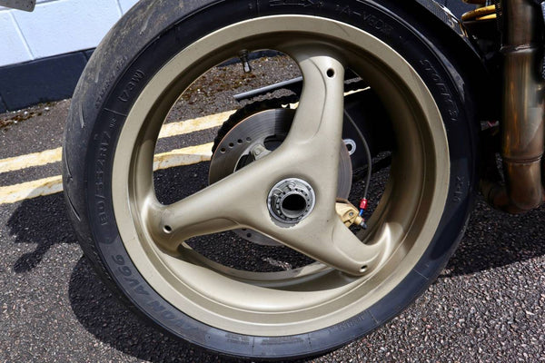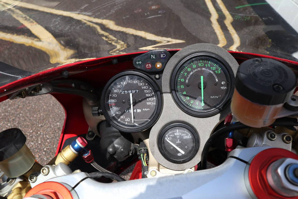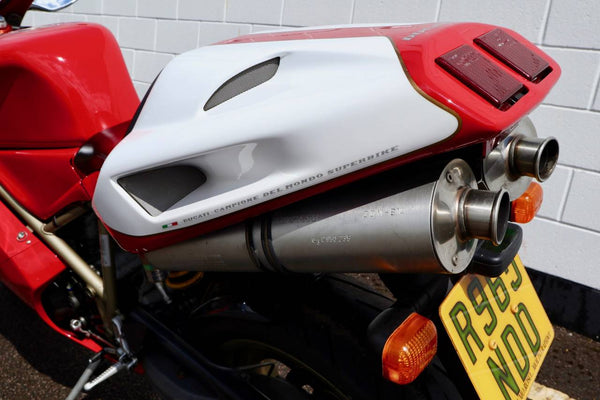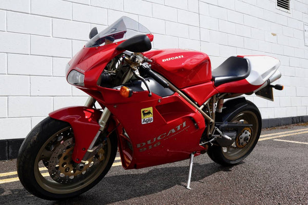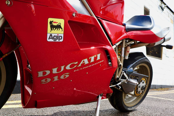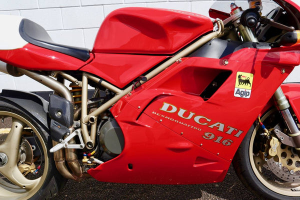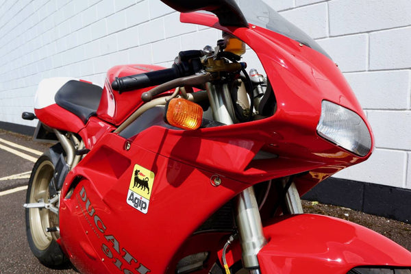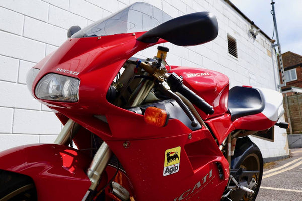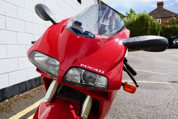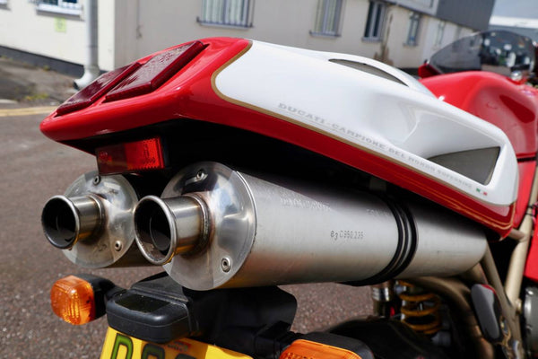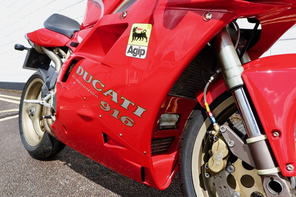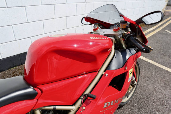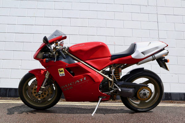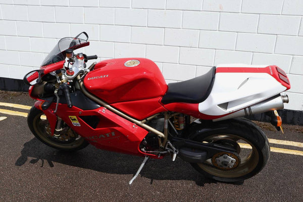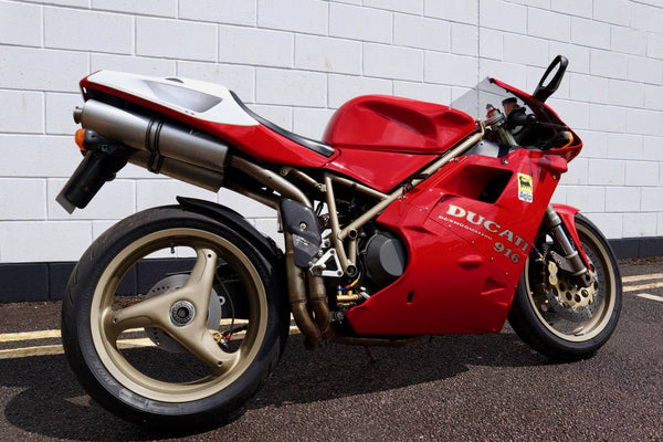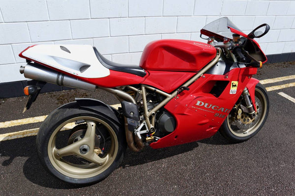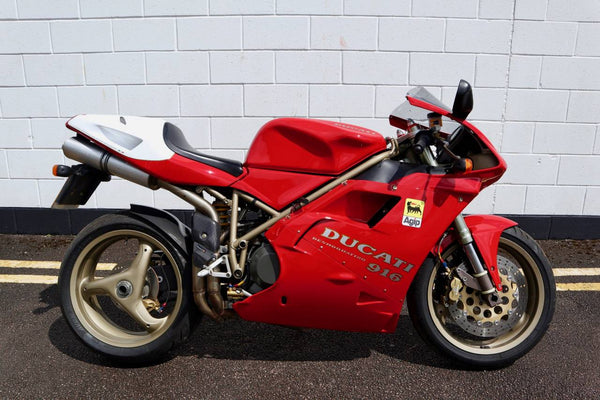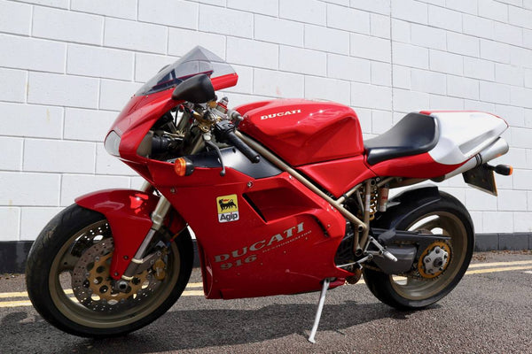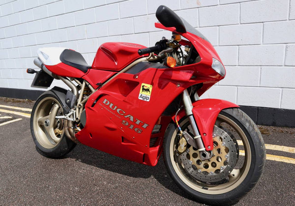 1997 Ducati 916. First registered on the 3.10.97 with only one former keeper from new! In very good condition having had the bodywork and tank painted few years ago. The current owner acquired the Ducati 22.9.98. The current mileage is just less than 26k, cam belts replaced at 25071 miles. MOT'd until 4.3.22, no advisories. Fully serviced and professionally resprayed last year. Single seat (it is a Biposto model). Some carbon items, incl Harris hugger and Goodrich braided cables. A Top example thats ready to ride!