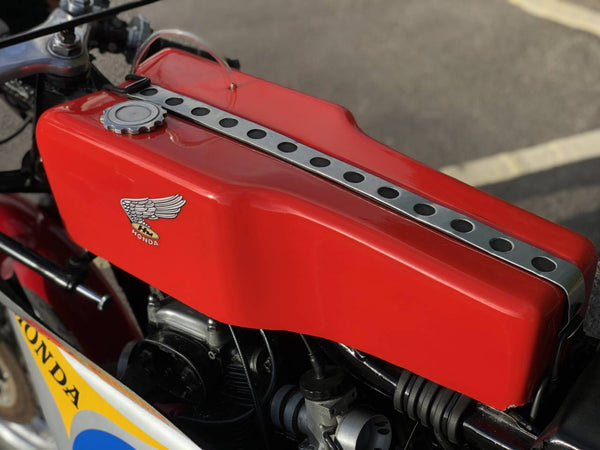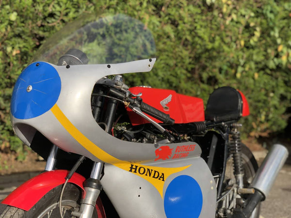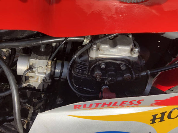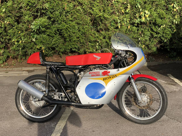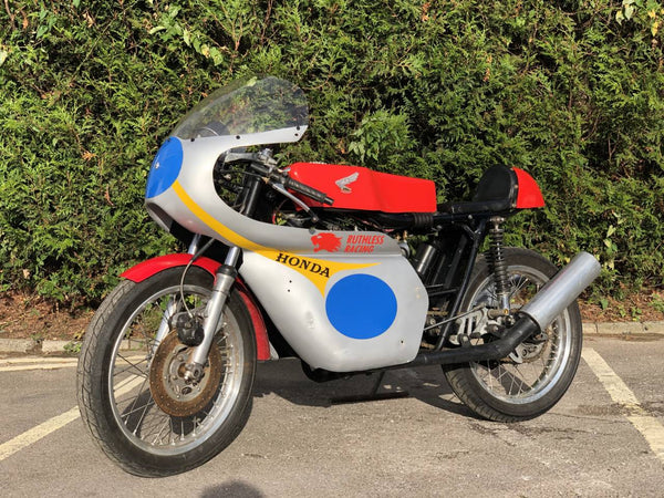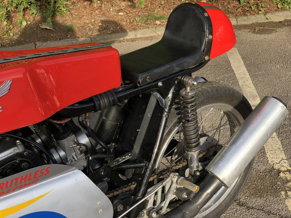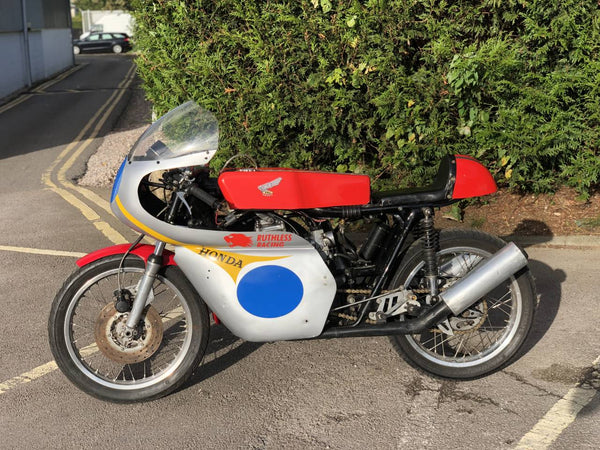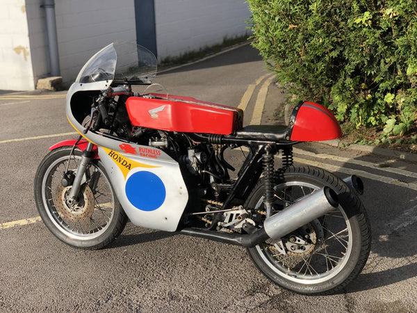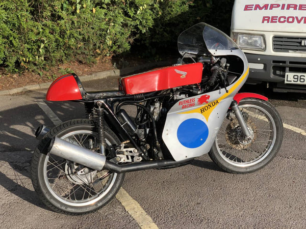 Honda 350 K4 Race bike, Not raced or paraded since extensive engine rebuild by Len Cooper of CAT Engineering (receipts for £1600). CRMC Registered. Easy starter. Rust Free braced standard frame, 400/4 type front end with cast iron disc , Gas Flowed Head (Pete Manley), lightened crank, race valve and springs, race cam (Believed to be Joy cam) Amal Mk2 carbs, recent battery, Engine rebuild included; new liners and Omega pistons, improved cam chain tensioner, cam chain. Koni shocks, alloy rims. Standard Gearbox & clutch. PVL ignition. With John Davis replica faring A lovely Quick Race Machine .