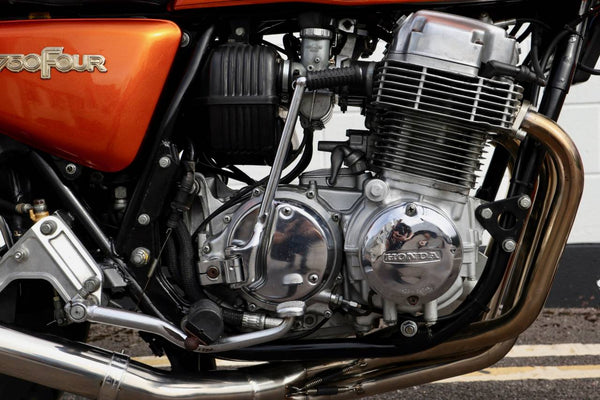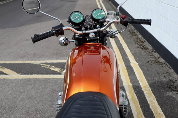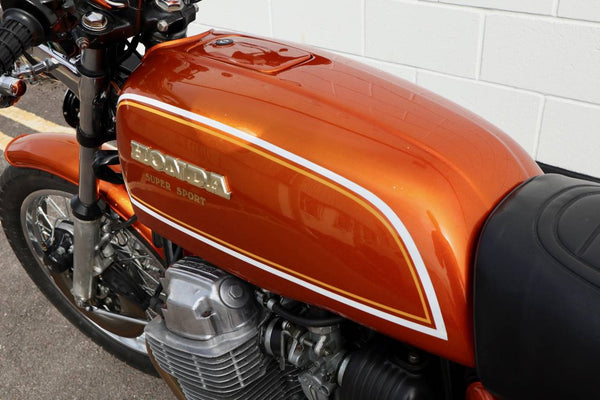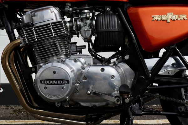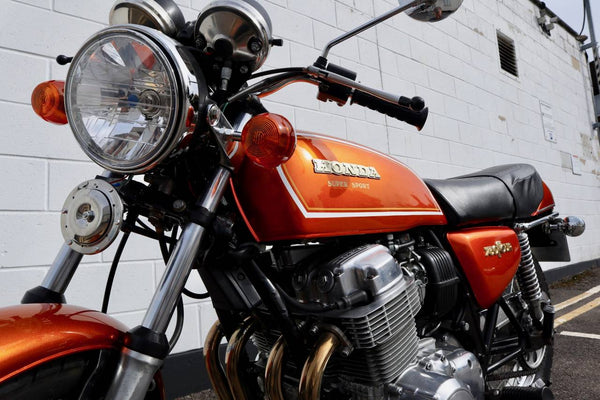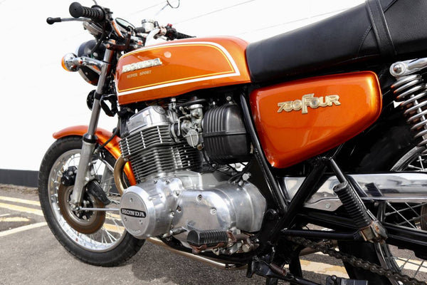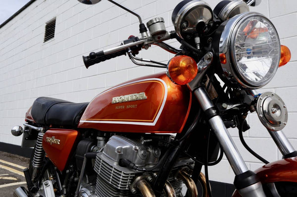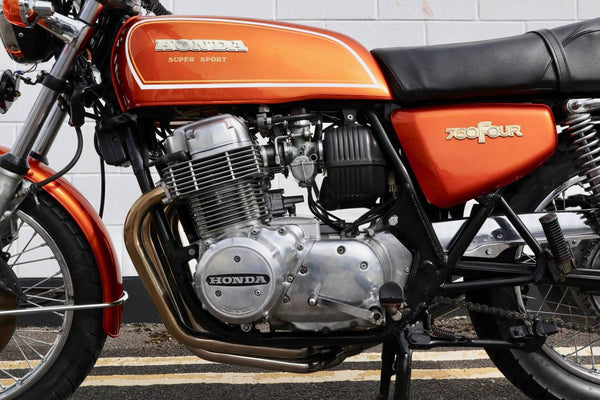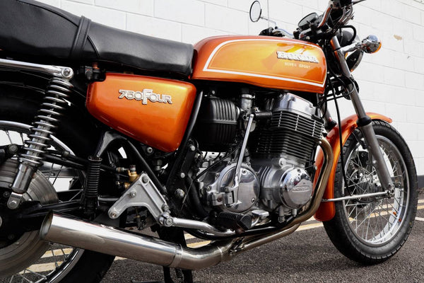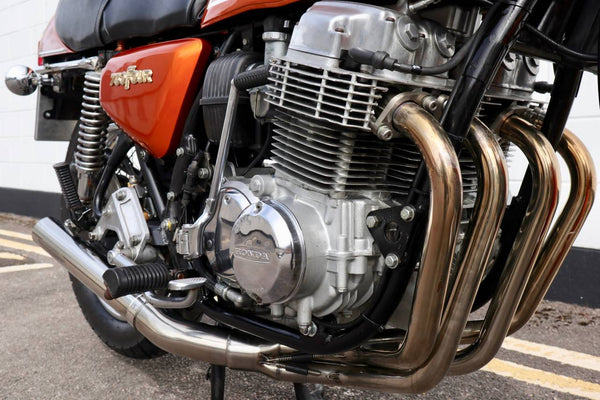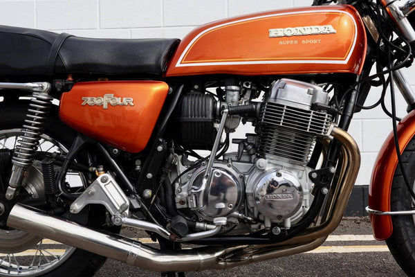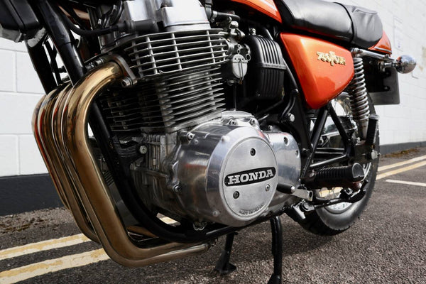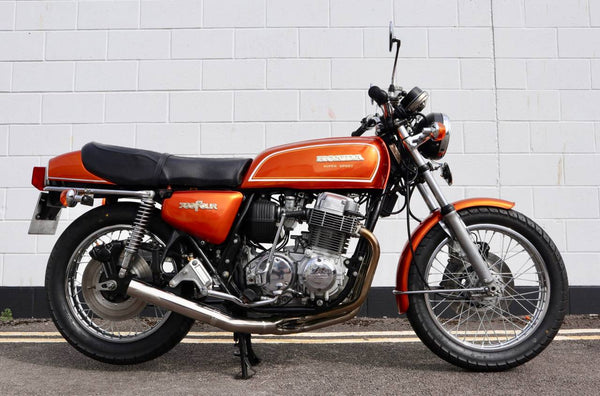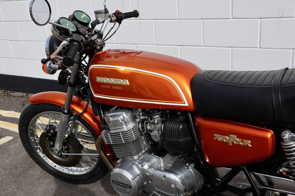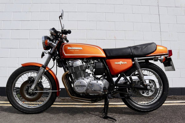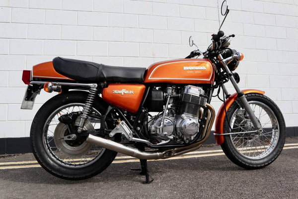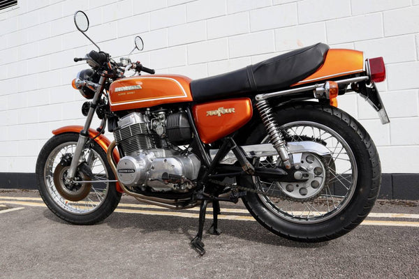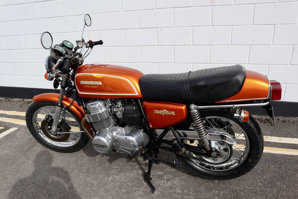 1975 Honda CB750FO. In very nice condition having recently had a new paint job and other recent additions such as new exhaust system, new tyres, rims & spokes, twin coils, leads and plugs, points, battery, seat cover,oil, oil filter, air filter, rebuilt carbs, headlight and indicators. Starts on the button and runs and rides very well!