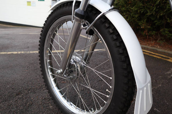 Sammy Miller Mk 2 high boy frame, Sammy Miller CNC alloy yokes, forks fully rebuilt and Re hard Chromed, New alloy rims with stainless steel spokes and nipples, New Tyers, tubes and mud guards, New renthal bars, grips and controls, New cables, New Tank, New Seat, Air box, Complete exhaust system, chain guard and chain tensioner, rear shocks and new carb. All from Sammy Miller where possible.