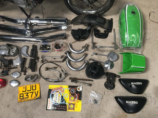 Kawasaki KH 250 Project 1980 Comes with Registration Document, New Seat and Repainted Tank, Original exhausts and Many Other New Parts To Help Complete the Restoration. All As Shown in the Photos an Interesting Worth While Project that should be worth close to £5K once Finished