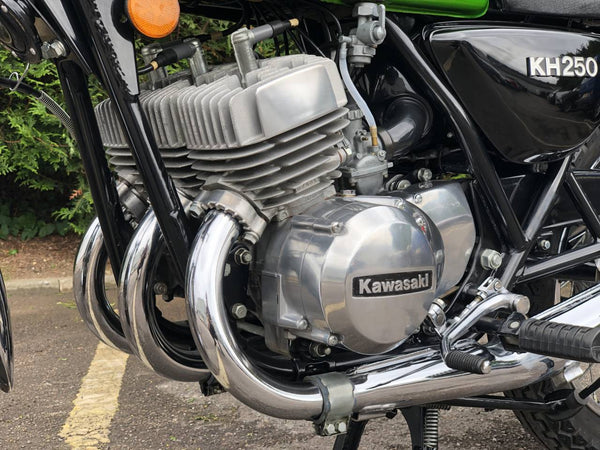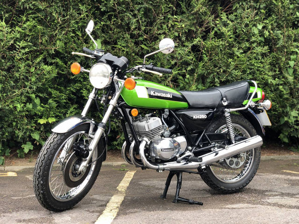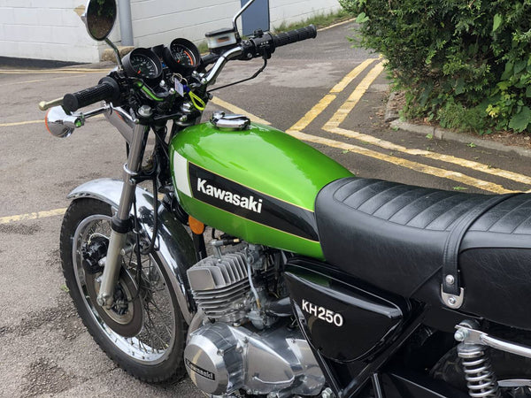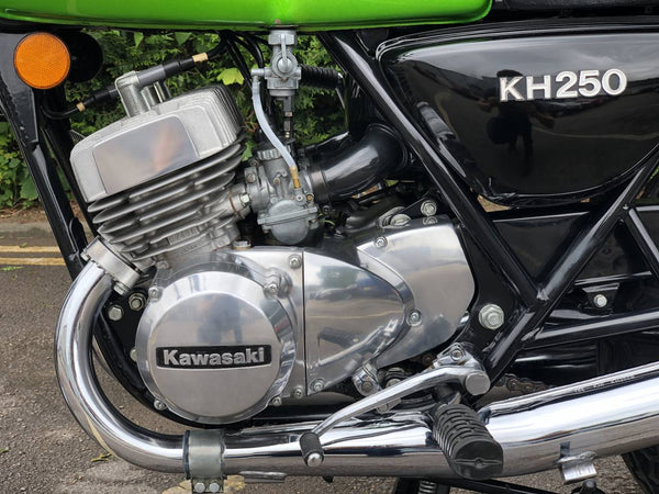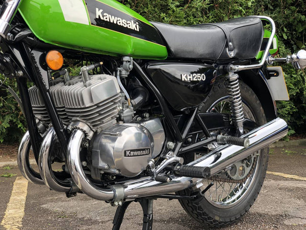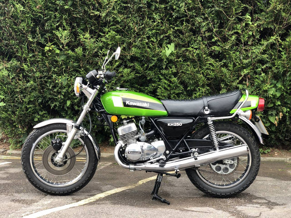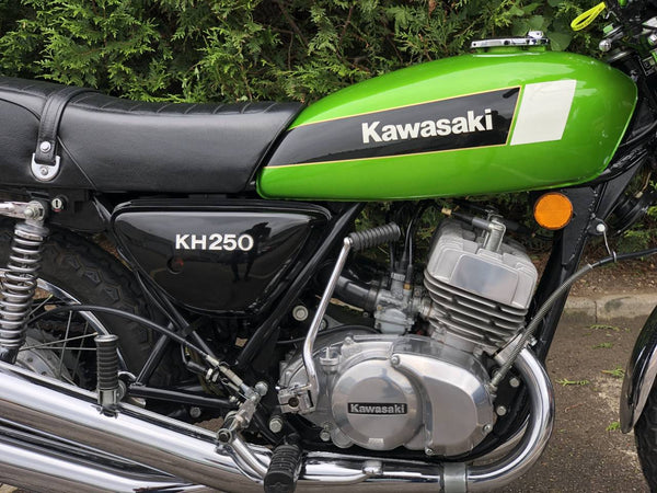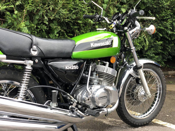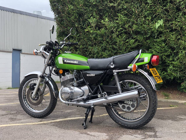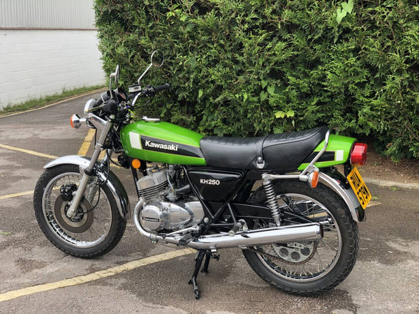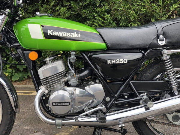 Kawasaki KH 250 1980 In fabulous green and fully restored a few years ago so still in beautiful condition showing just over 9000 miles with old mots but far less since the amazing restoration! Starts first prod of the Kickstart ticks over straight away and rides just as it should . Recent Mot with no advisories . Cost far more to restore than the asking price!