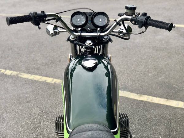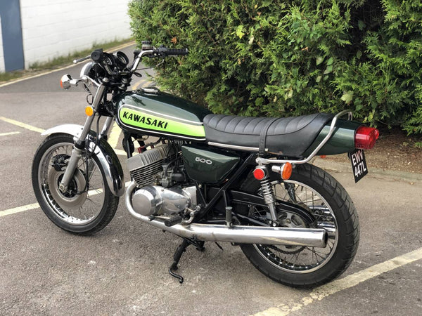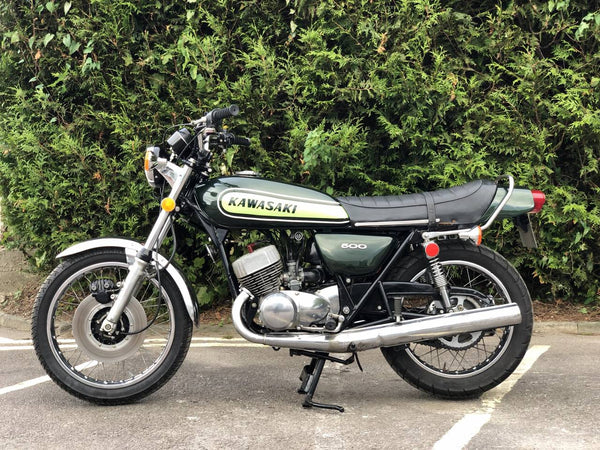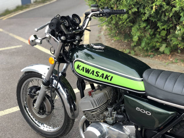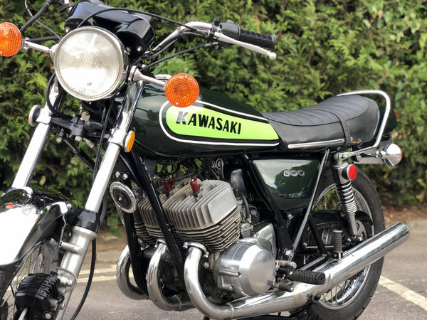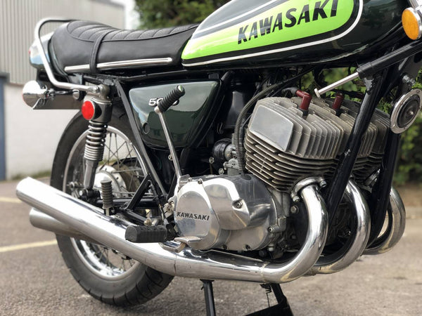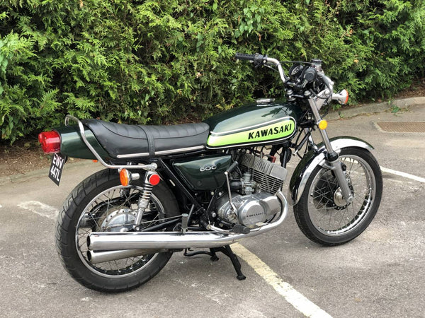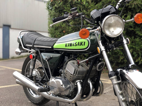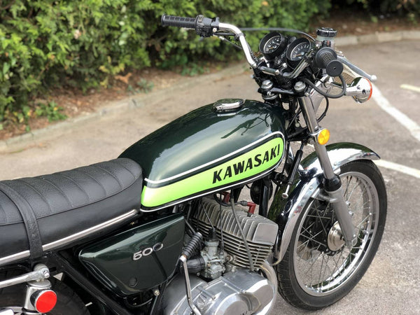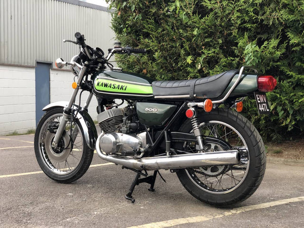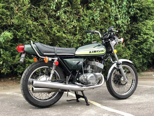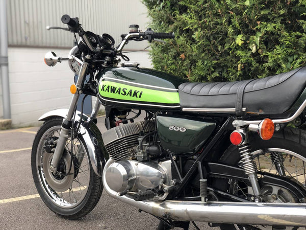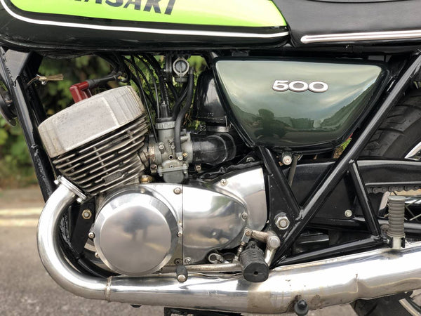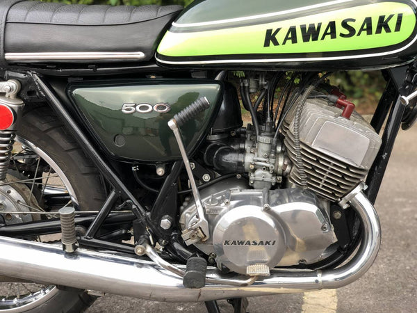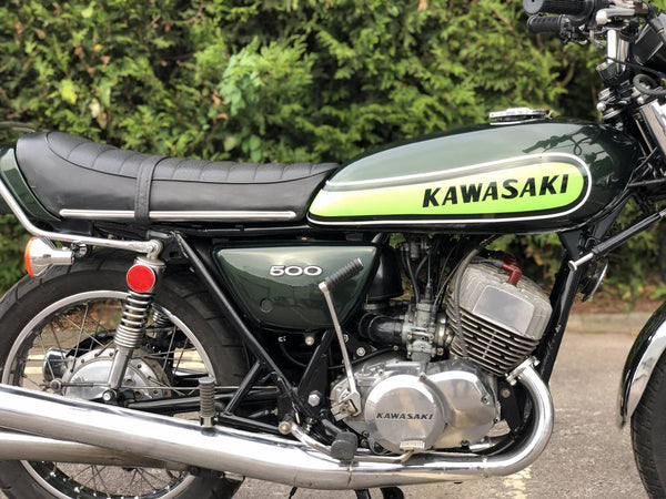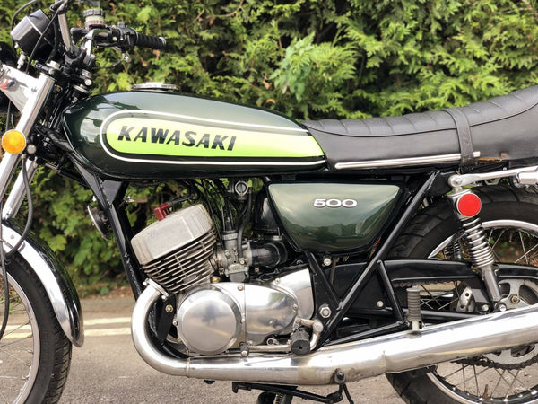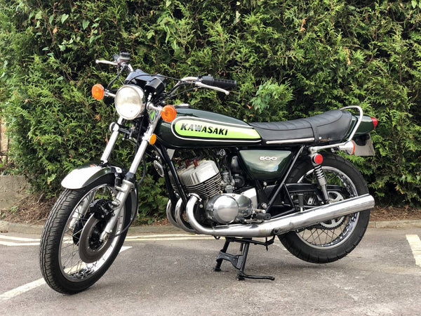 Kawasaki KH500 1972. This is a lovely two tone green example which starts easily runs and Revs cleanly and crisply and rides a treat .