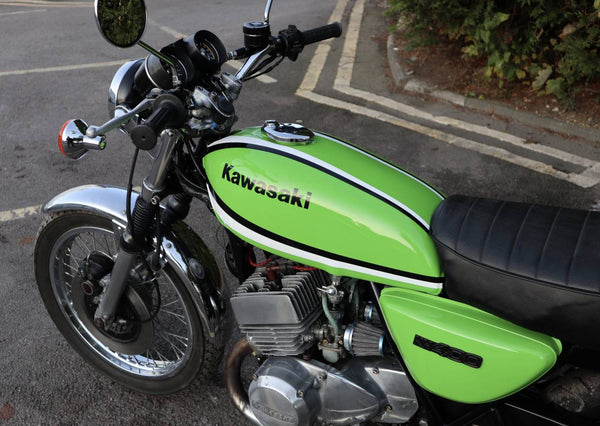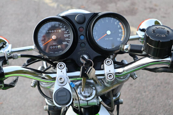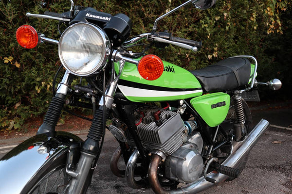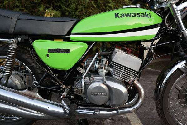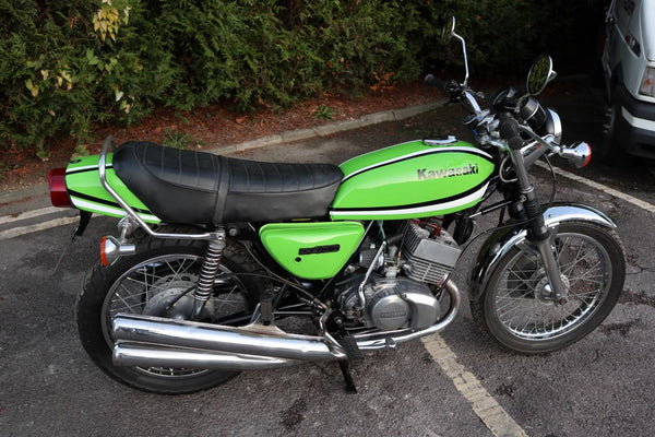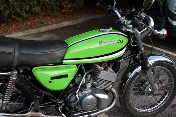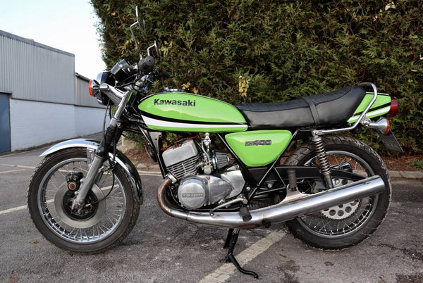 1976 Kawasaki KH400. This is the first year of the KH400 model prior to this the 400cc Kawasaki triple was called the S3. looks to in good usable condition with everything working well. It's an easy starter with a smooth and sprightly motor. I great investment that you can have some fun on.