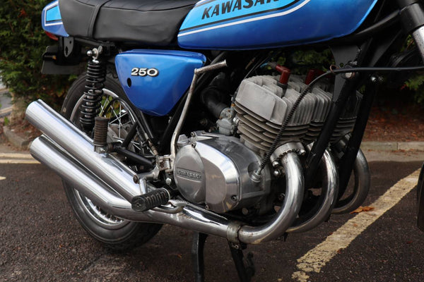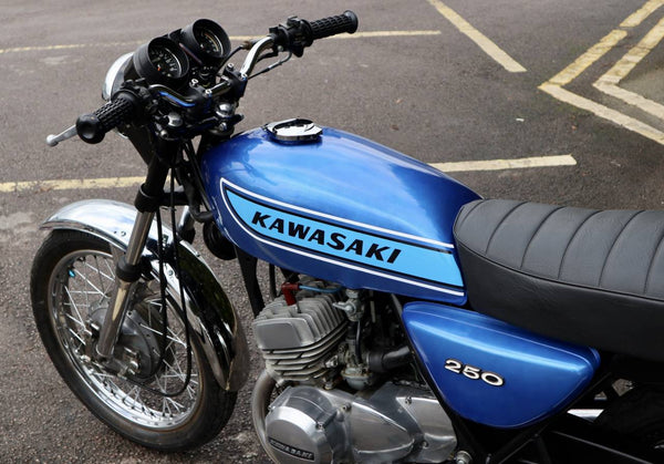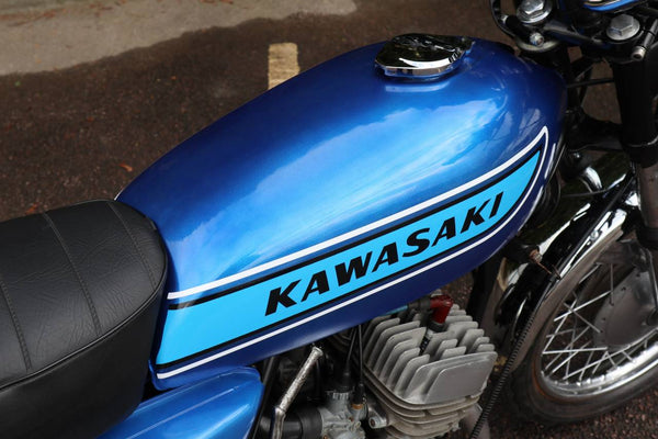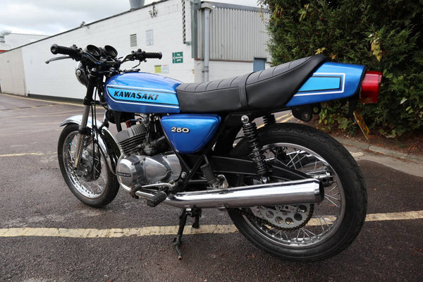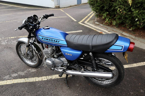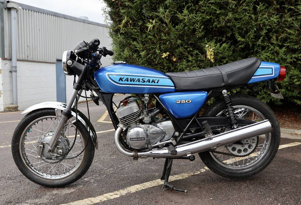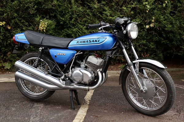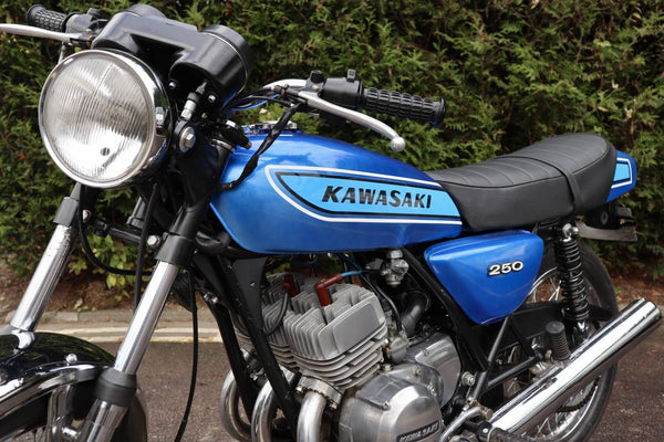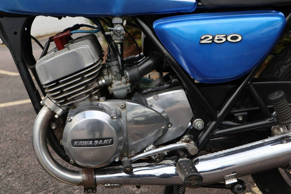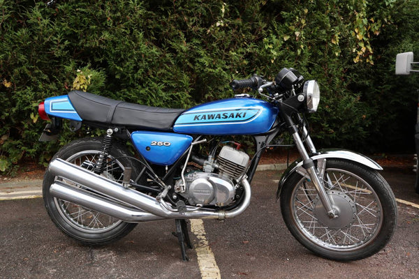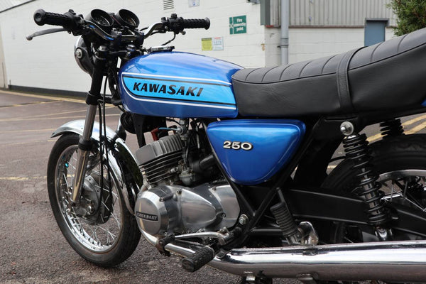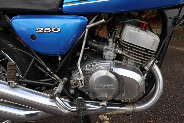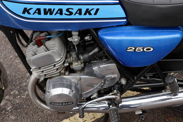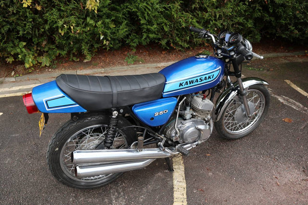 1975 Kawasaki S1C 250cc. In nice usable condition with new paint. This is a UK registered bike from new. It has a std bore honed with new pistons rings, small ends only done about 100 miles since rebuild. The gear box has a new second gear, oil pump rebuild and new forks seals. Comes with indicators. The 250cc 1970 2 stroke market is very strong making this a great investment!