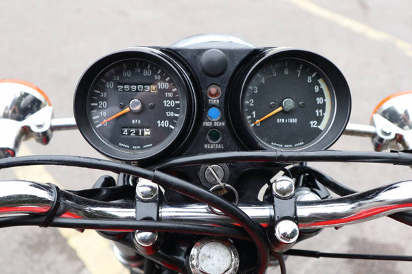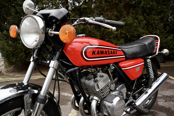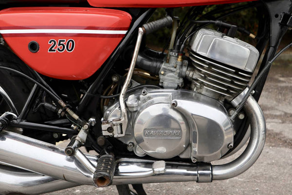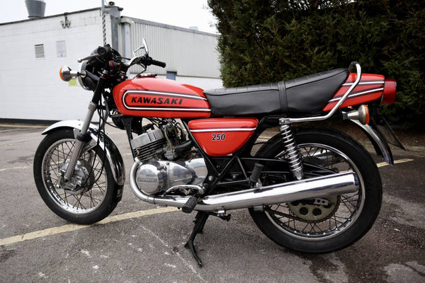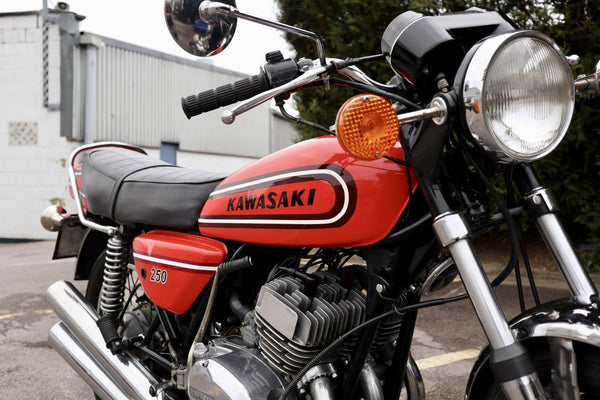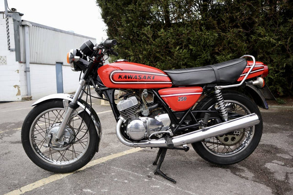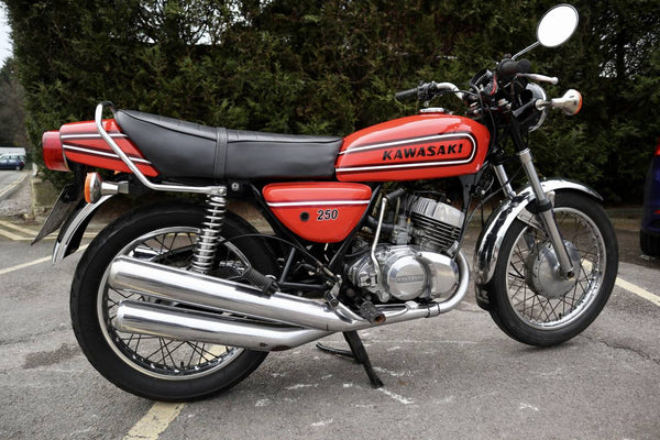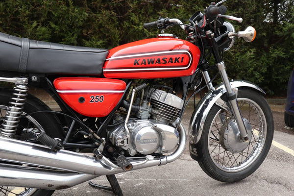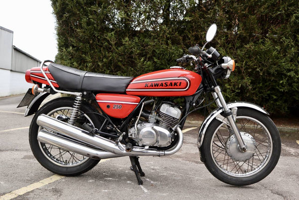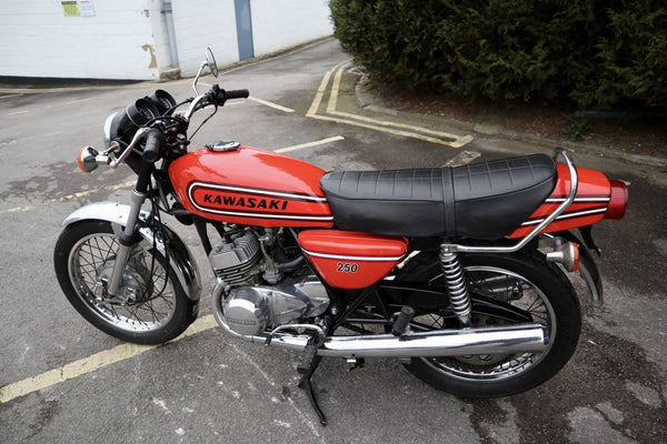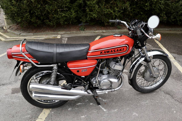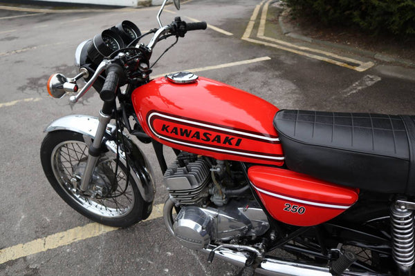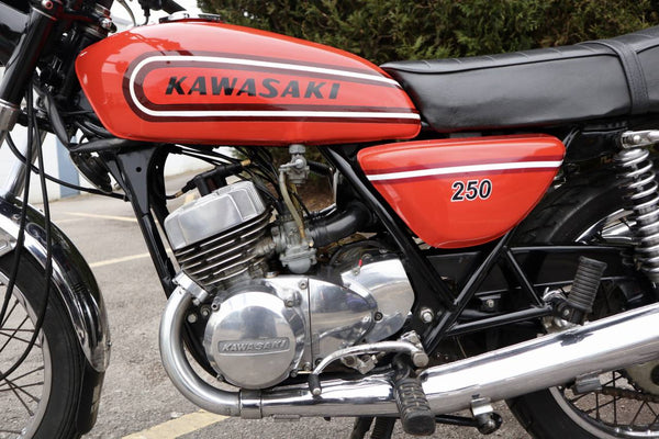 Kawasaki S1E 250 1974. This bikes in very good unrestored condtion and runs and rides very well. Previously owned for 26yrs and with low mileage of 500 per year ! Has had many new parts fitted including battery, brake shoes, chain, rear sprocket , carbs cleaned and new mikuni jets fitted, new seat cover , etc .. all normal maintenance items . The bike is ready to ride and looks great in its Red and Chrome colour scheme , and is Tax free and Mot Exempt.