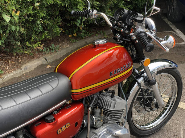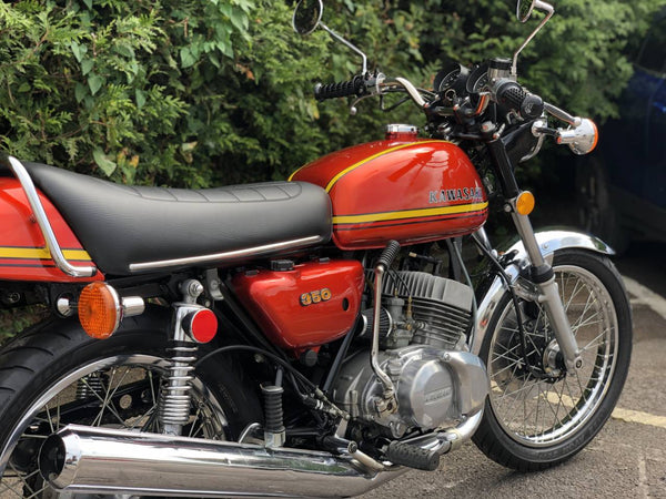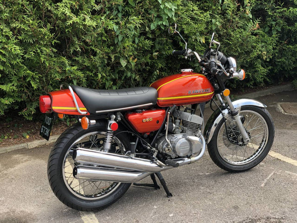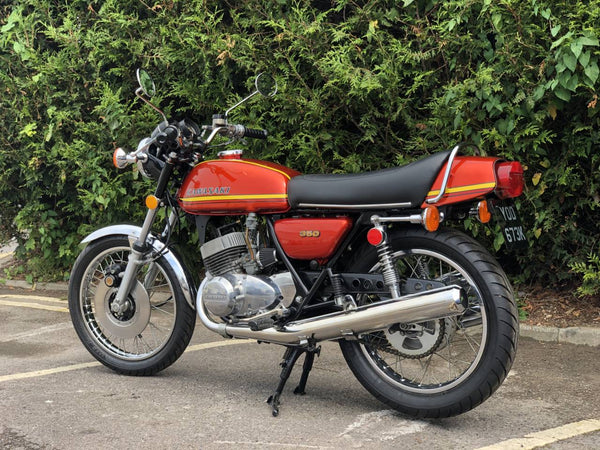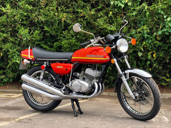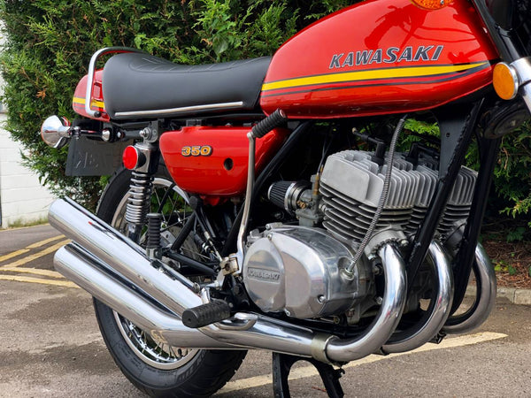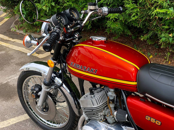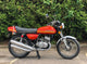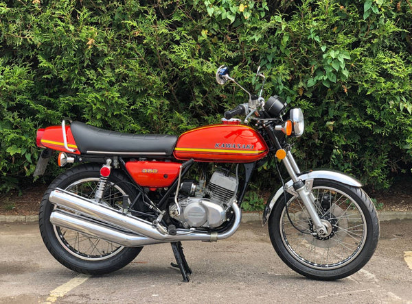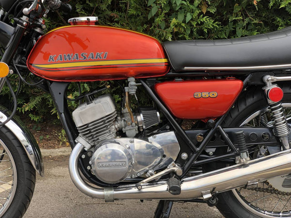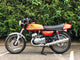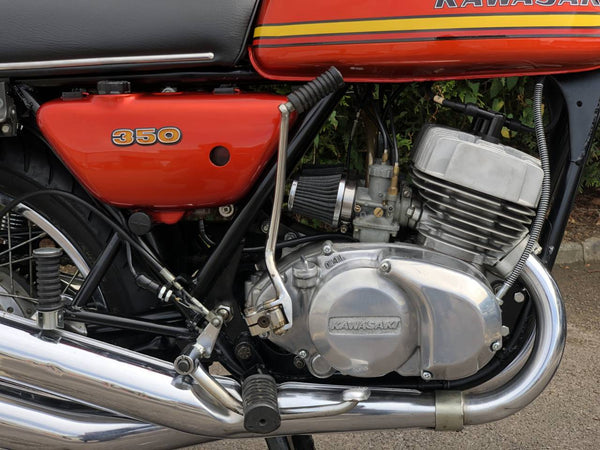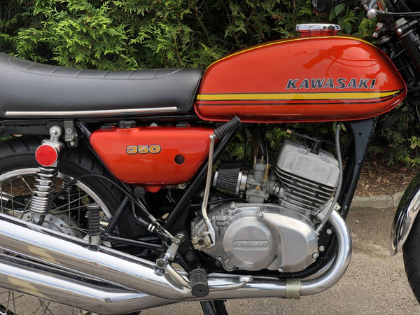Kawasaki S2 1972 350 cc In Burnt Orange. This is a lovely example that has been well restored both Mechanically and Cosmetically and only covered 200 odd miles since the Rebuild . Has correct frame and engine numbers , Starts very easily ticks over very well and Revs quickly and cleanly and rides spot on . Has the original chrome rims and K & N performance air filters . Excellent all over Condition , All in all a great quick pre KH middleweight which are now very desirable.