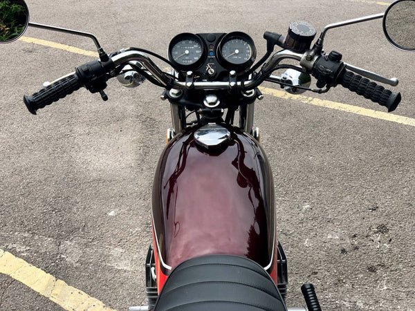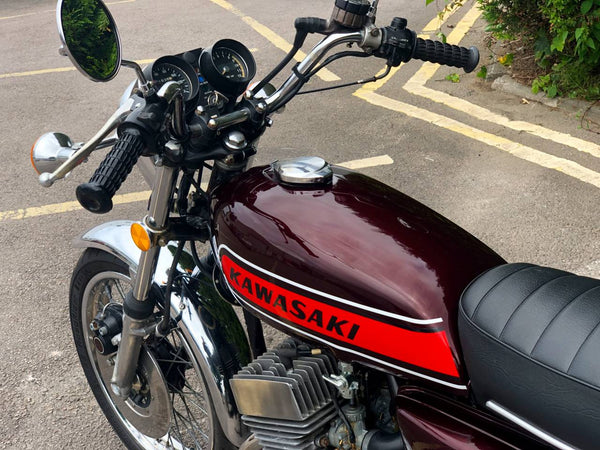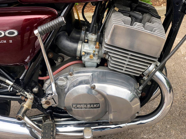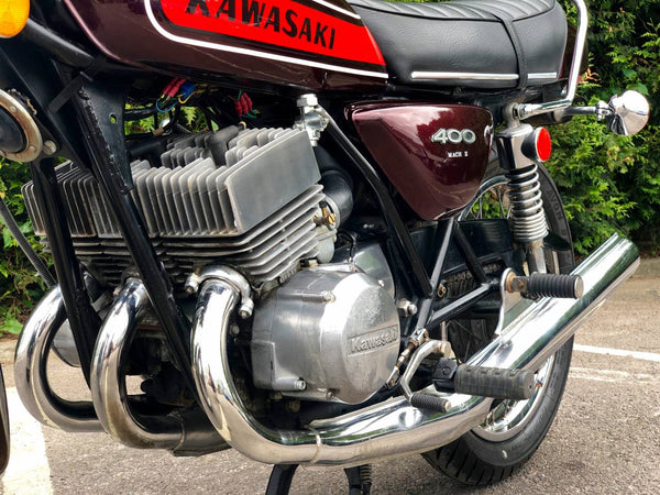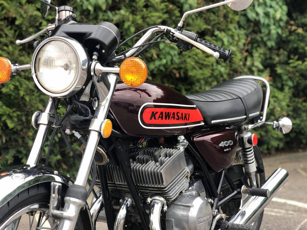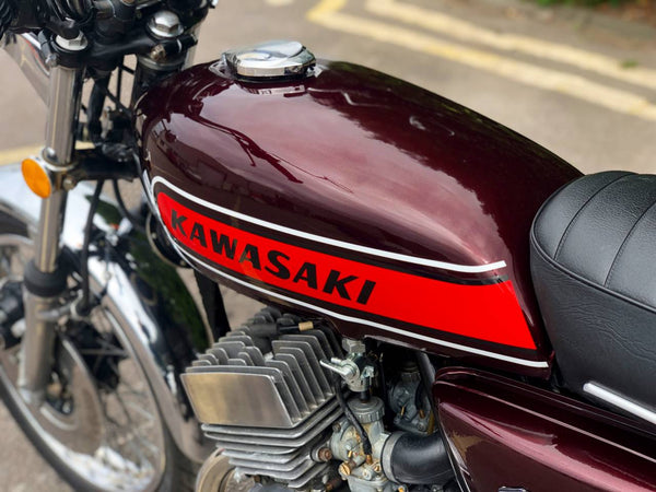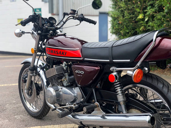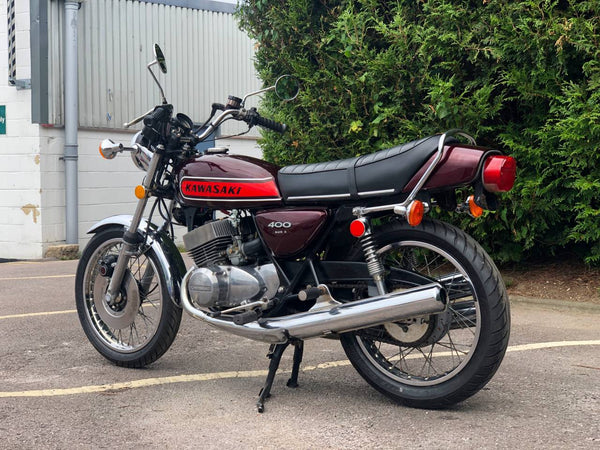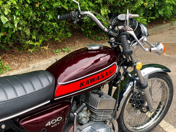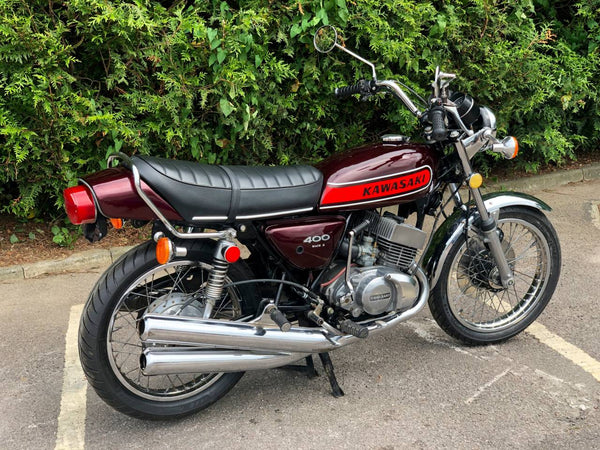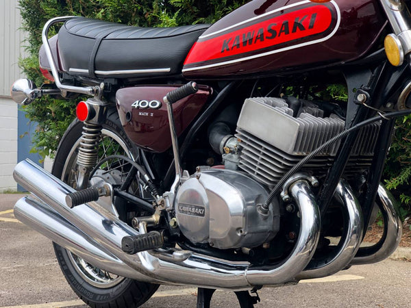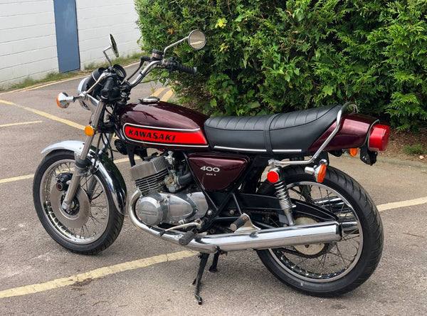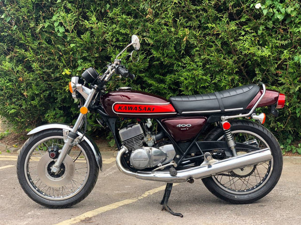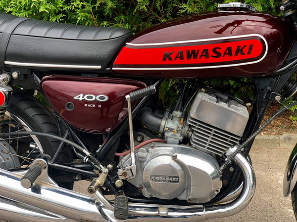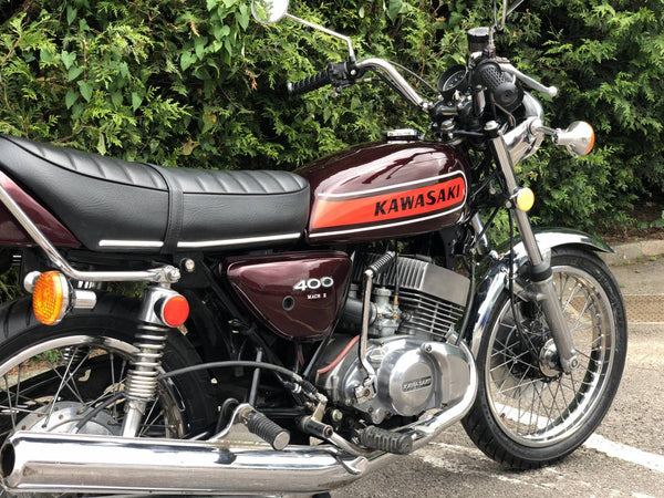 Kawasaki S3 400cc 1974 In Lovely two tone deep red / Purple . The S3 is now a rare pre KH model with more horse power and a lovely compromise between the 250 and 500 . Starts first or second prod of the Kickstart ticks over straight away rev clean and rides as it should.