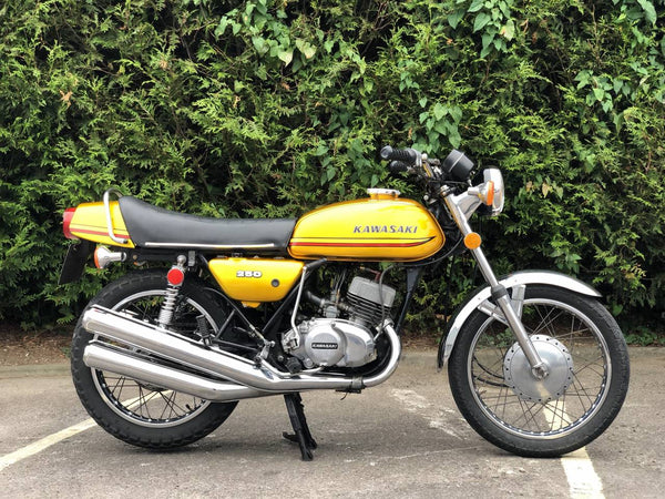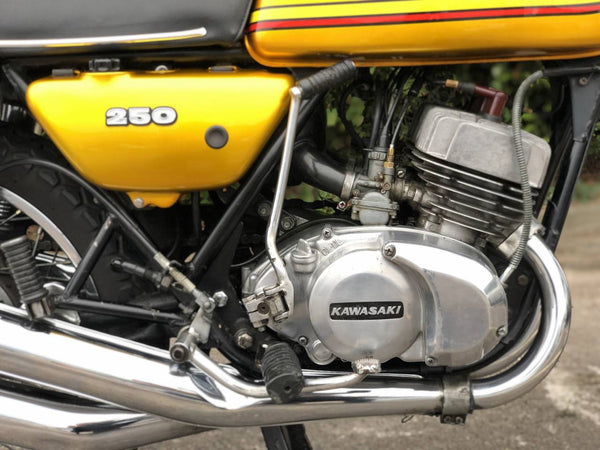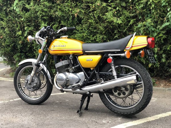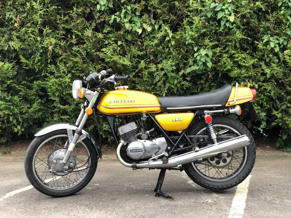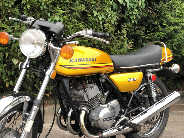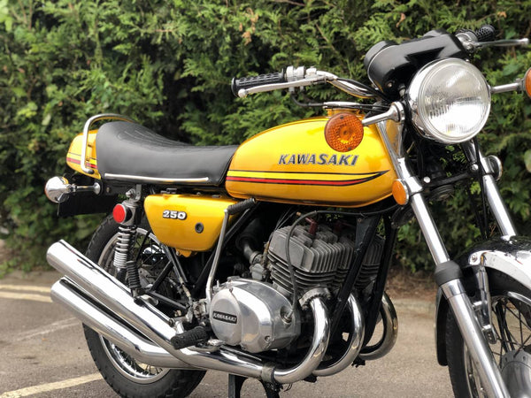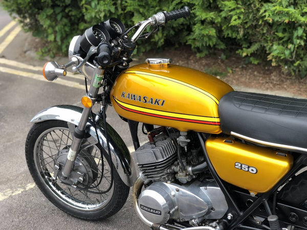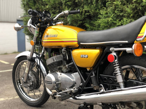Kawasaki S1 250cc 1973. This very attractive example in Candy Gold was restored a few years ago and still looks lovely with more power than the later KH model and very attractive drum brakes . It starts easily Revs cleanly and rides well too. Very original with correct rims and tyres from new, also has its original engine and frame as confirmed by a Kawasaki dating certificate. Great looking bike good fun and a sound investment .