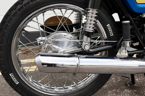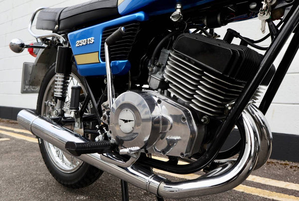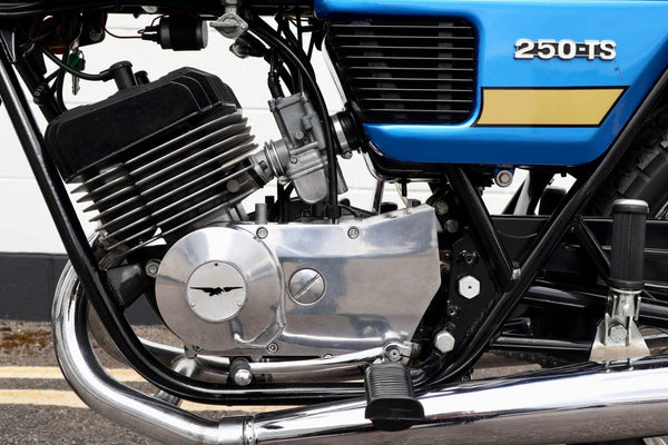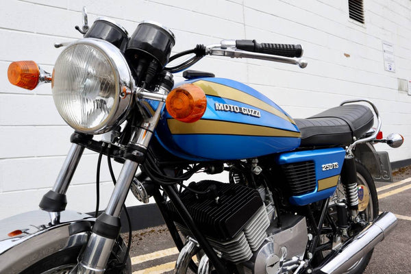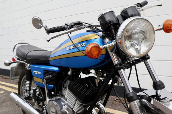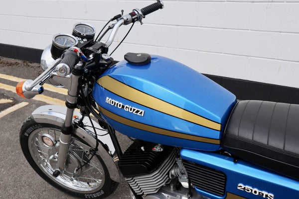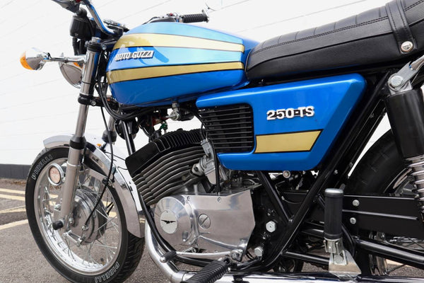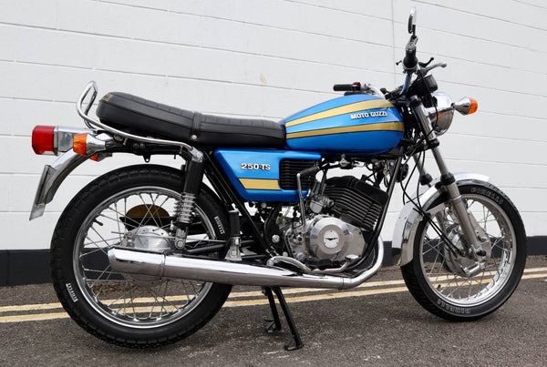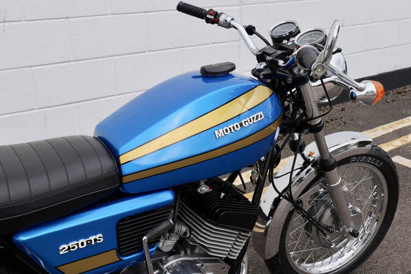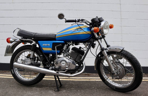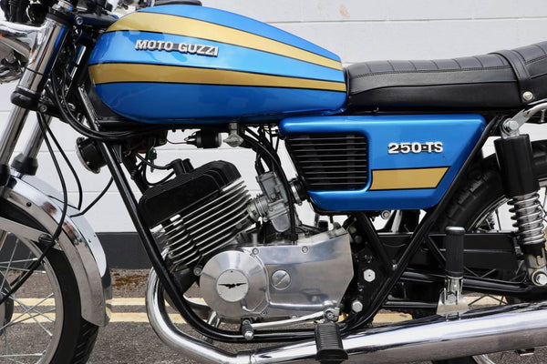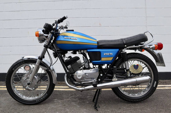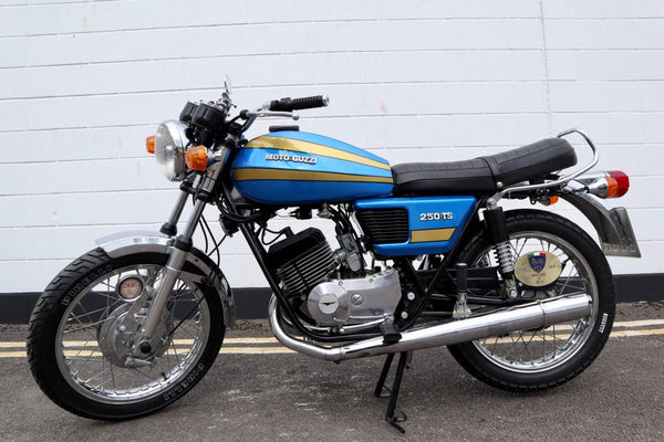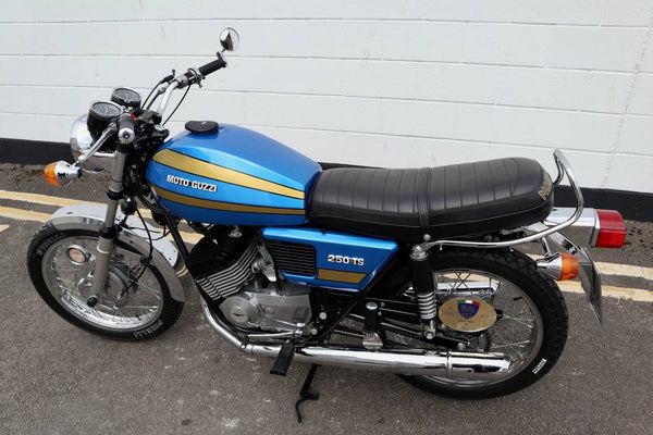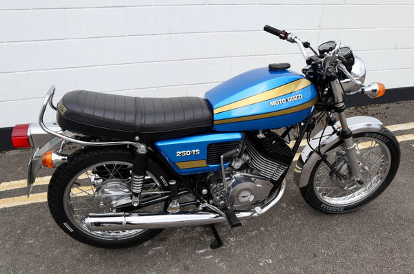 1974 Moto Guzzi 250TS. In great condition, looks to have been restored with all its original parts. Comes with a Certificate from the old Italian bike register confirming c it to be 100% original. Runs and rides very well. This is a rare 250cc two stroke and was quicker than the KH250, GT250 and the RD250. Ready to ride or show and a great investment !