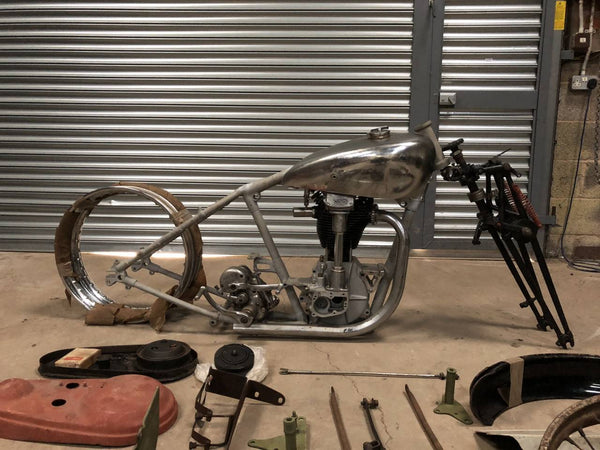 Its About 90% Complete, With Chain guard, Seat Springs, Front Fork Spring, Foot Pegs and Carb Missing. The Oil Reservoir Is From An Norton Inter. The Engine Is In Nice, Unmolested Condition And Was Partialy Rebuilt With New Piston, Big End Bearings And Cylinder Head. There Is However A Welding Mark On The Ignition Cover , As They Used A Different Magneto While It Was Being Raced. The Petrol Tank Was Restored In And Out , With New Chrome Plating .