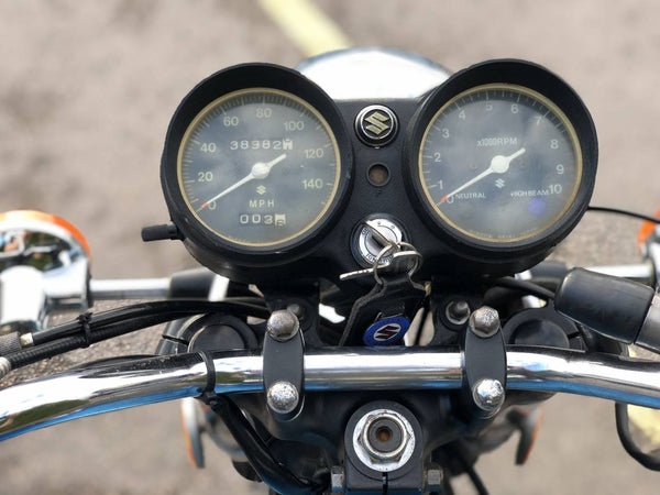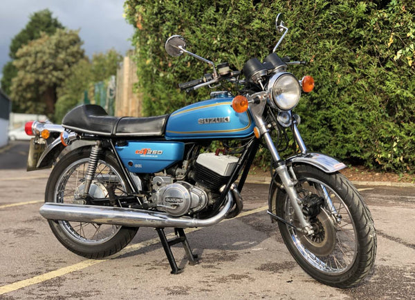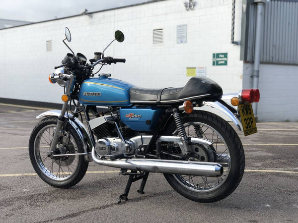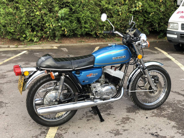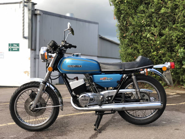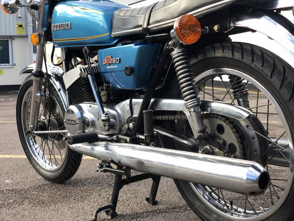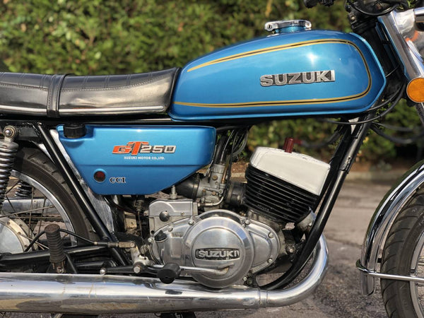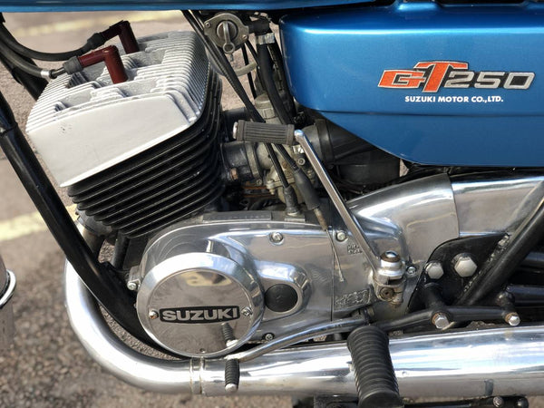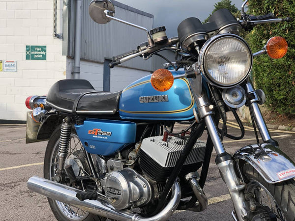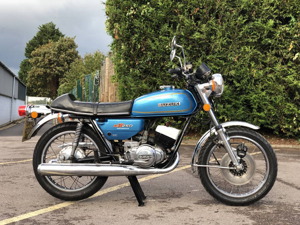 Suzuki GT 250 1976 in Blue a Uk Registered Model not an import . This Example is extremely original and still in its lovely original colour .