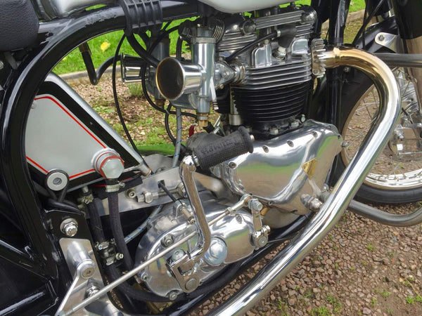 Triton 1956 650cc with wideline featherbed frame, road holder forks, alley tank, central oil tank. Pre-unit t110 motor with 9 stud Bonny top end and belt drive primary. With twin monoblocks TLS vented front brake and chrome rims.