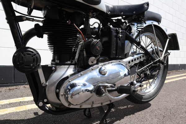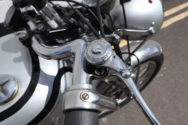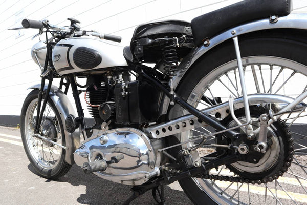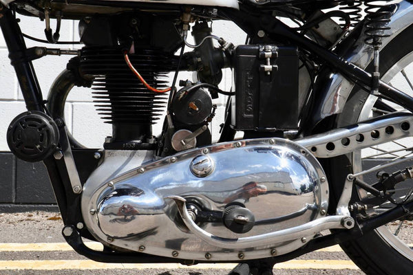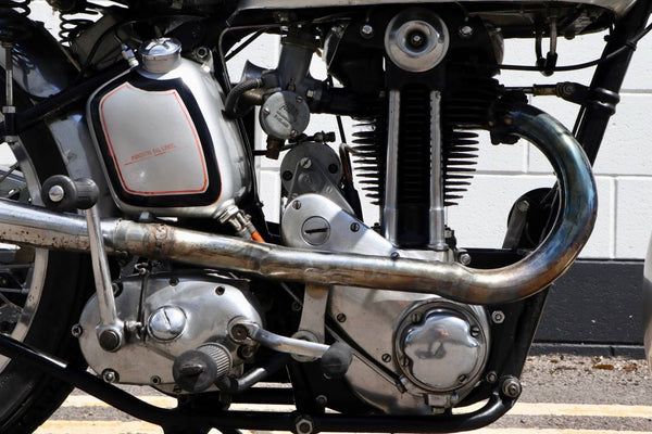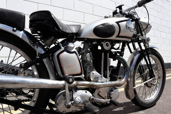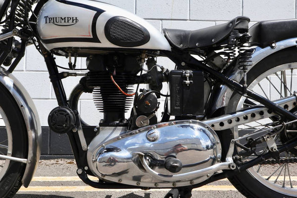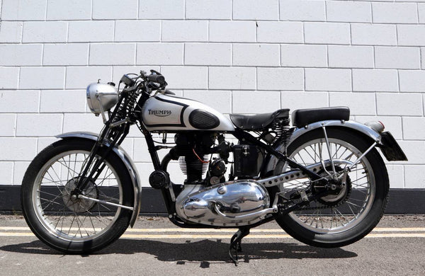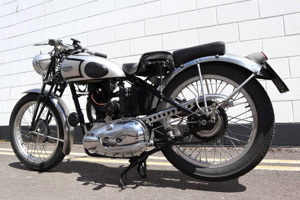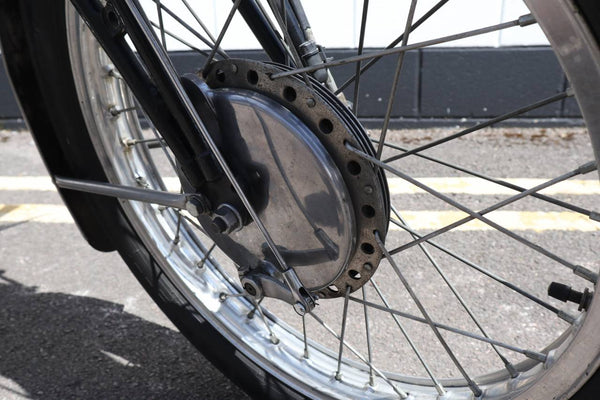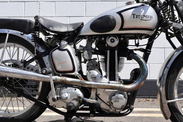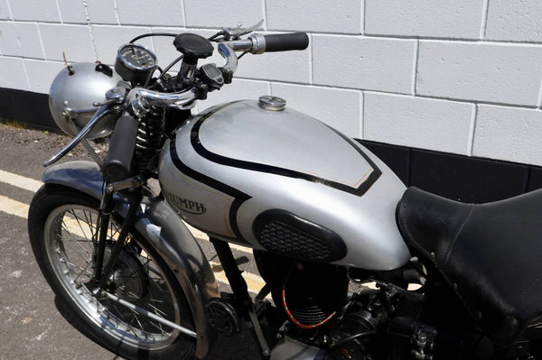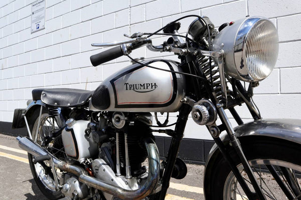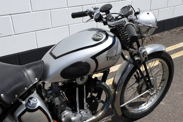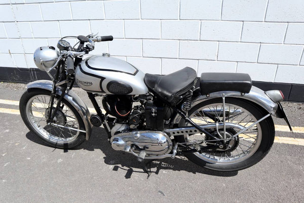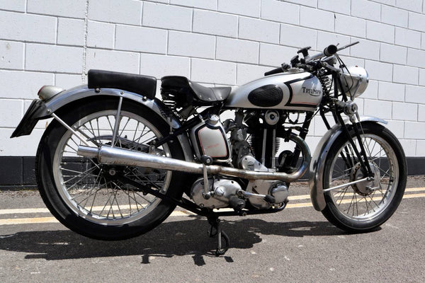 1939 Triumph 350cc 3HW. In very nice condition with some patina, With Italian front brake, guards, Head light, Handle bars and Allie rims which give the bike a sporty/purposeful look. Has recently returned to the UK from an elderly gentleman's private collection near Lake Como in northern Italy, where it has been for the last 50 years. Now registered with a current UK V5. The Triumph was registered in Vicenza on 22nd June 1950. Sounds fantastic and runs very well. Ready to ride!