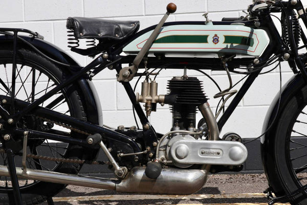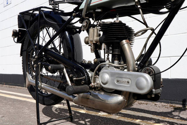 In the twenties Triumph had to fight hard for their market share. Their answer to the competitors was a basic 500cc bike: it was very was cheap – £42.17s.6d -the type SD, also a 500 cc side valve single, was £83.00. By using new mass production methods labour costs were cut. There were some teething troubles with engine and clutch quality in the early series; when these problems were solved the design turned out to be very practical. More than 20,000 Model Ps were sold. Peter Cornelius is the author of several “Triumph – The Facts” booklets covering most of the Triumph models manufactured between 1915 and 1934. A quote from his booklet on the model “N”: “The 1927 Model N was a logical progression from the very successful 494 cc 1925/26 Model P. Basically the same engine was used with the addition of an internal ‘semi-automatic’ oil pump along with the later evolvement of the model P gearbox. These were placed into an updated frame with Webb single spring forks and a brake shoe rear hub replaced the long-used dummy belt- rim brake. The single internal band front brake remained but beaded edge tyres disappeared for ever and wired-on rims and tyres were fitted.(…)”