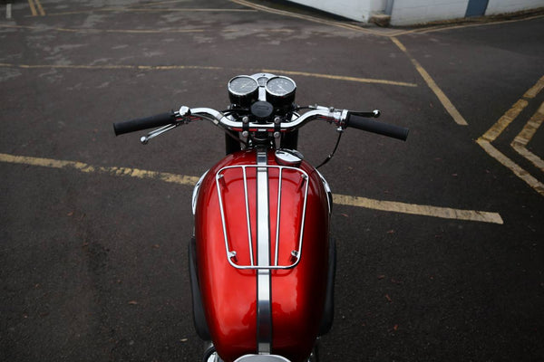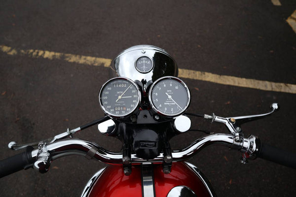 Work includes: All stainless fasteners, powdercoated frame, professional respray, fully rebuilt engine and gearboxbox with work done by SRM, new Burlen monoblocs, new Boyer ignition, new seat, new exhausts, new wiring, new headlight and taillight, new headlight, new bars, recon chronometric revcounter, ultra rare Bonnie 140mph chronometric speedo, new controls, forks, etc from Ace Classics, new stainless rims and spokes and tyres, basically a brand new bike