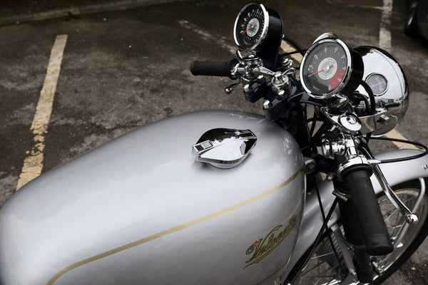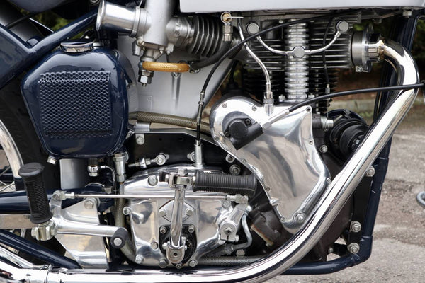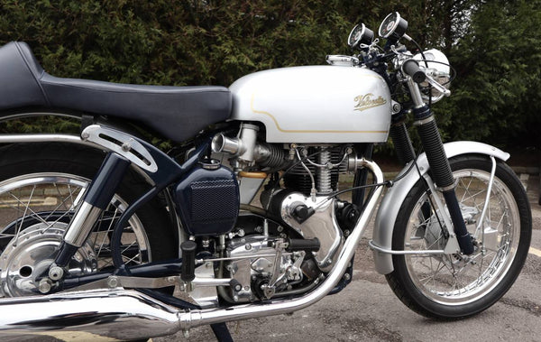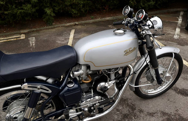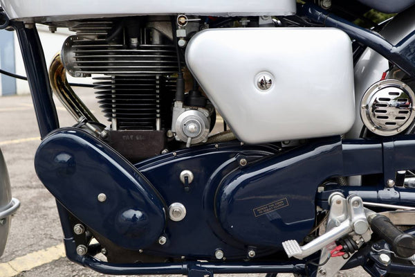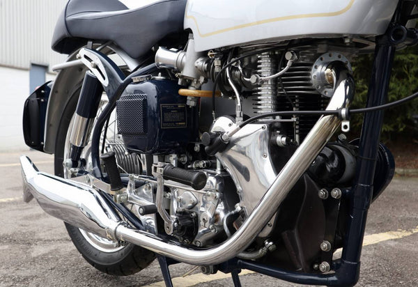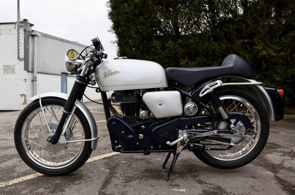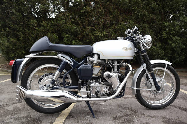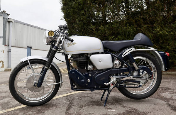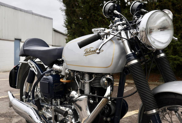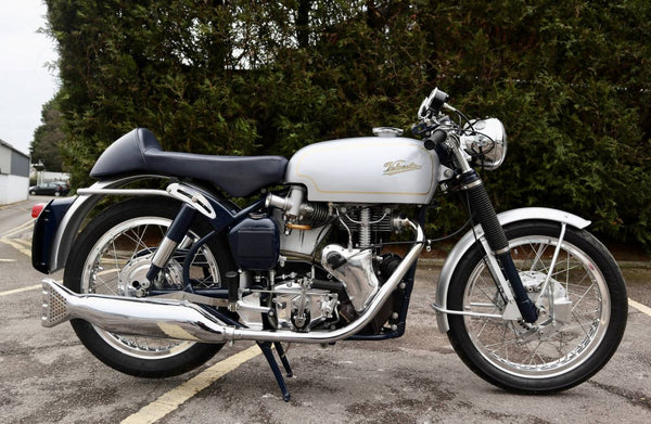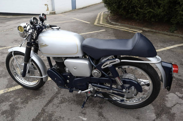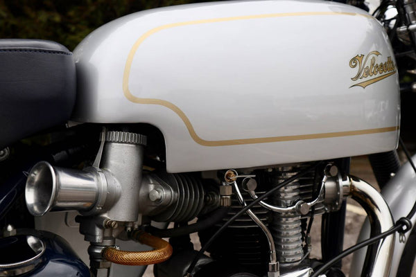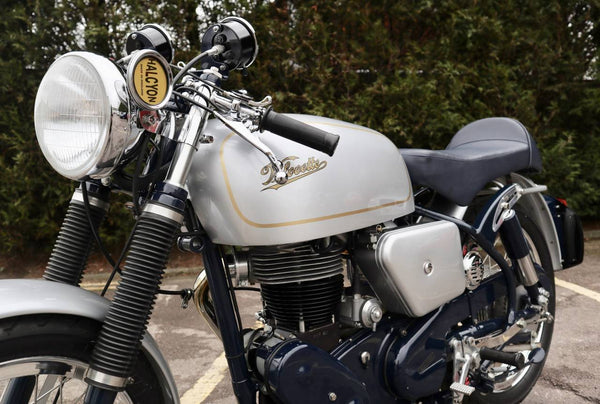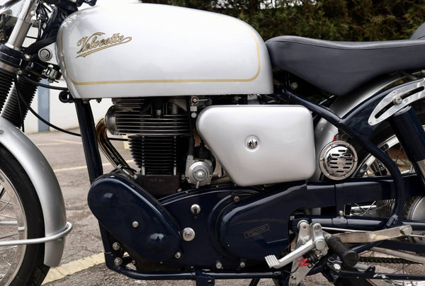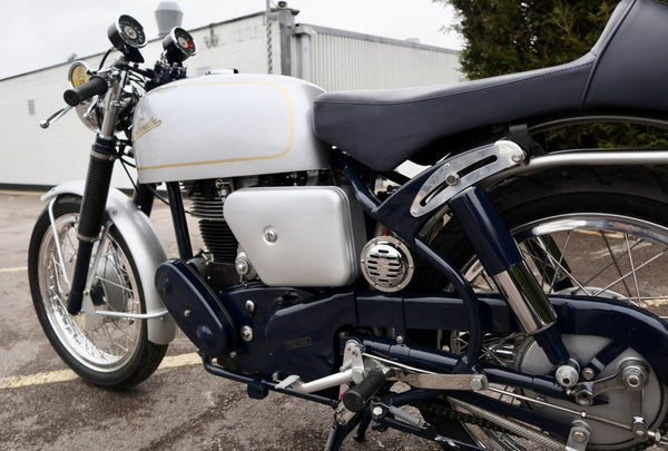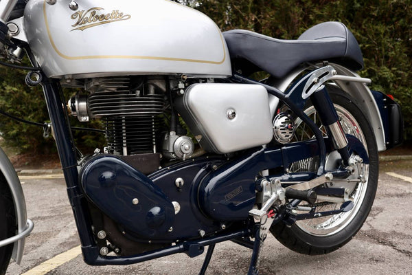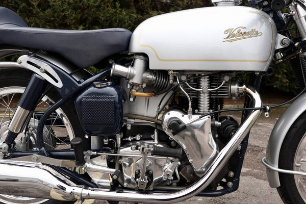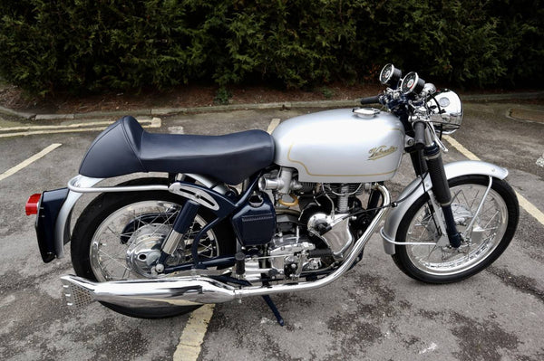 Velocette Thruxton 1966 500cc. Looking Beautiful having been fully restored to a very high standard with only 7 miles on the clock. In rare silver and dark blue colour scheme. The frame, engine and gearbox are all correct and original as they left the factory confirmed by the factory records which state the bike was dispatched from the factory on the 19 of August 1966 invoice number 75945.