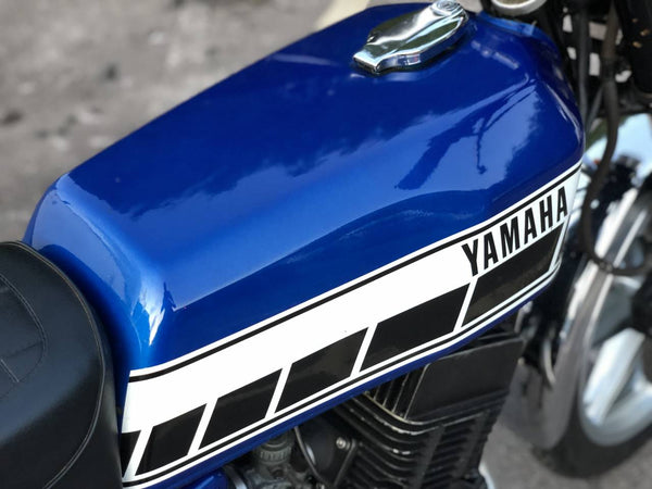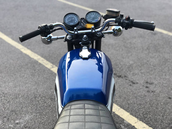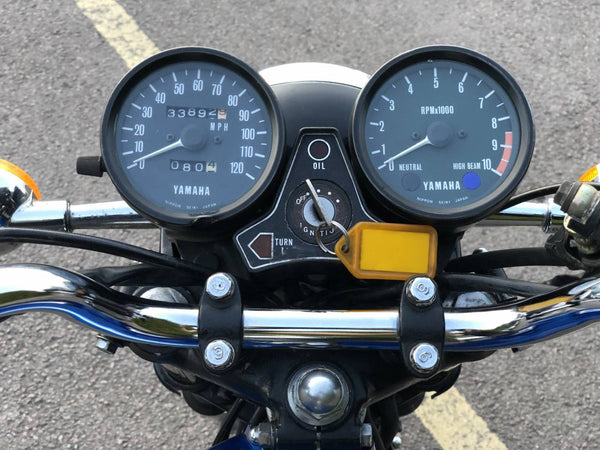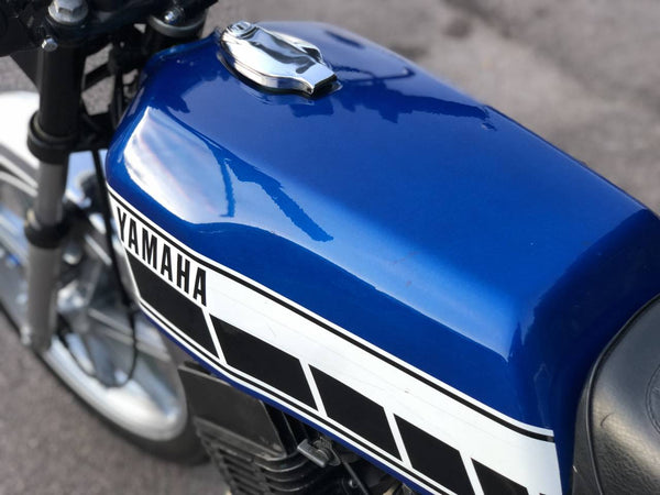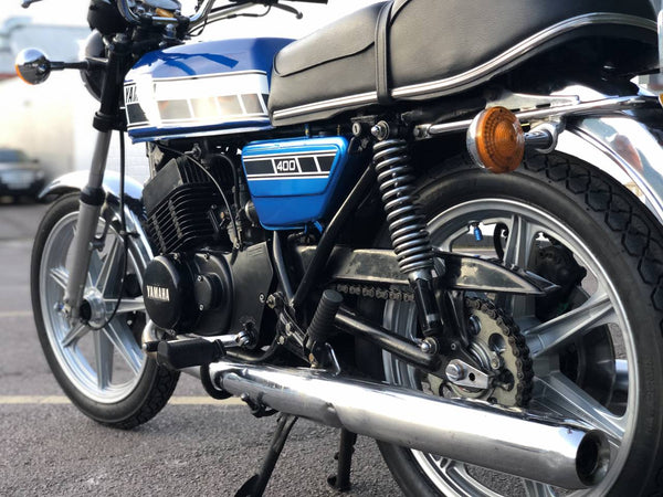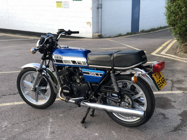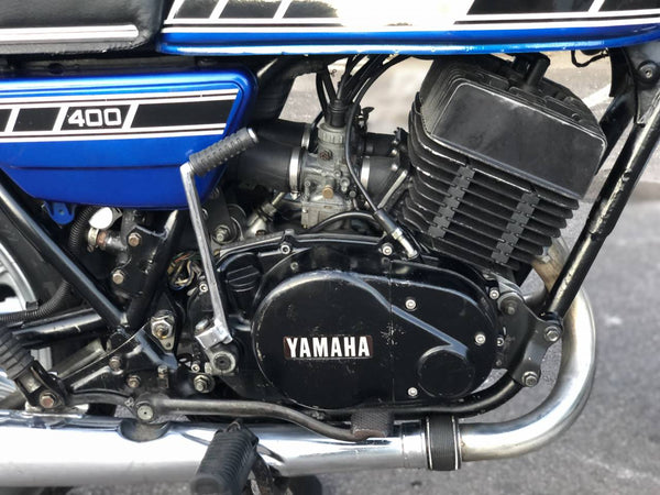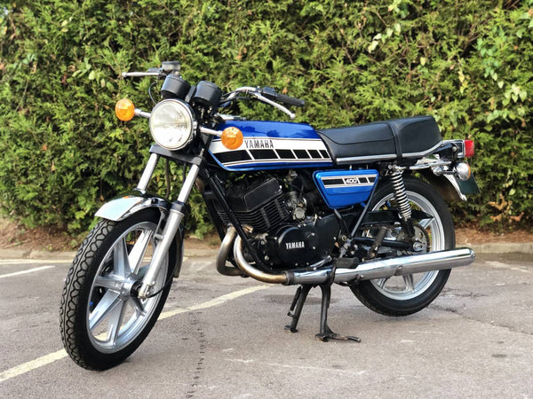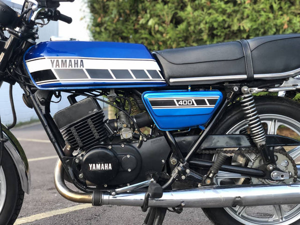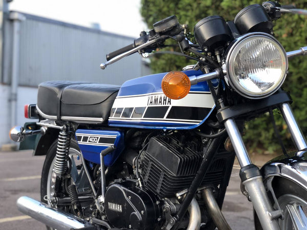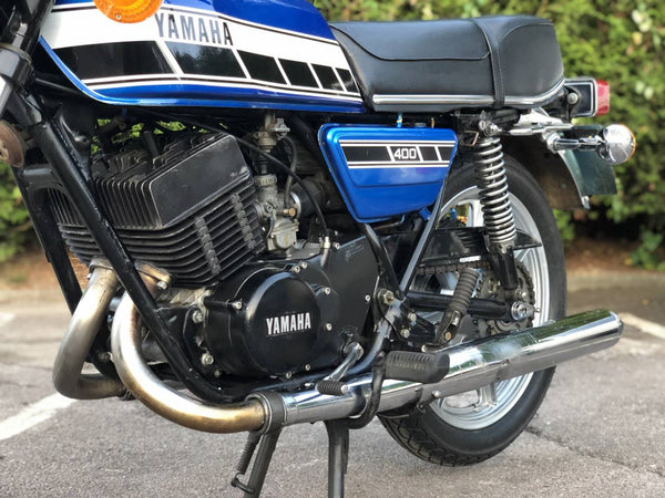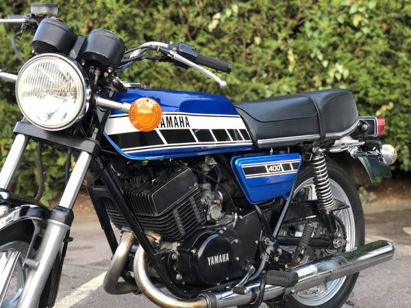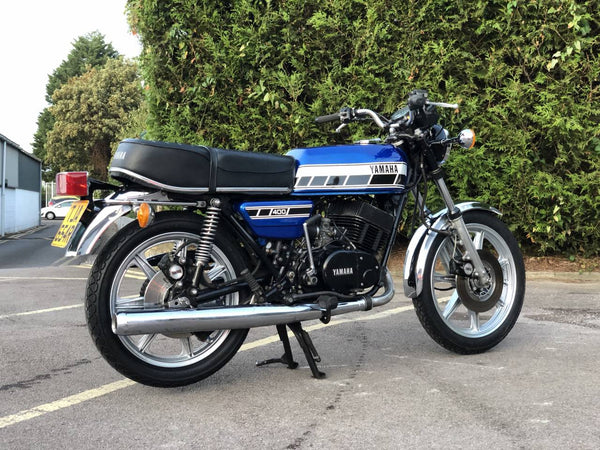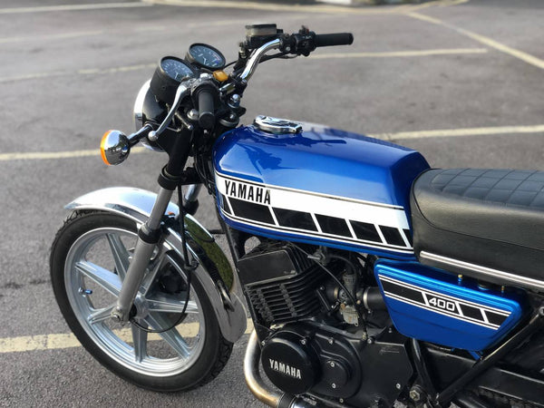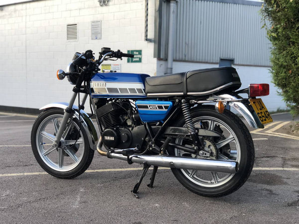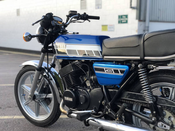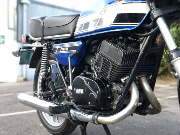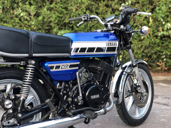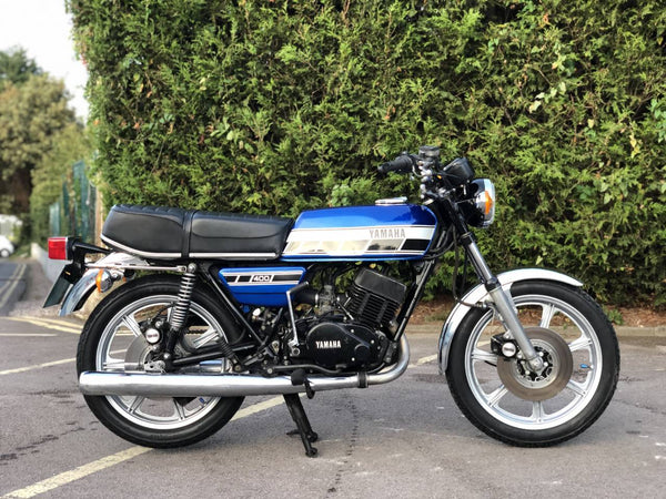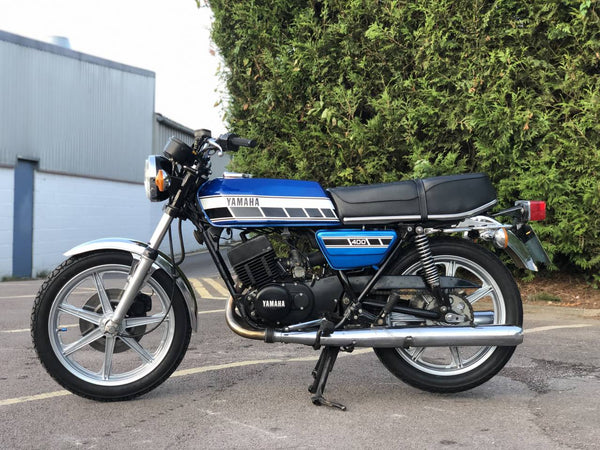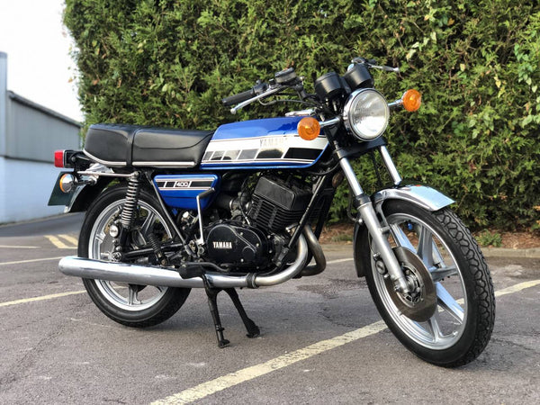 Yamaha RD 400 C 1976 In Blue With Matching Numbers. This example is extremely original with the mag wheel option. Starts 1st prod and Revs cleanly with a very sweet sounding engine and it rides lovely too one key fits the Ignition and seat lock. For its age it’s looking good though as not Restored has battery acid marks on the pipes and the odd ding in the front mudguard .. all normal ware and tear items that you could improve on if you wished , but still looking very presentable .. see photos and video. Now very sought after and a good investment .