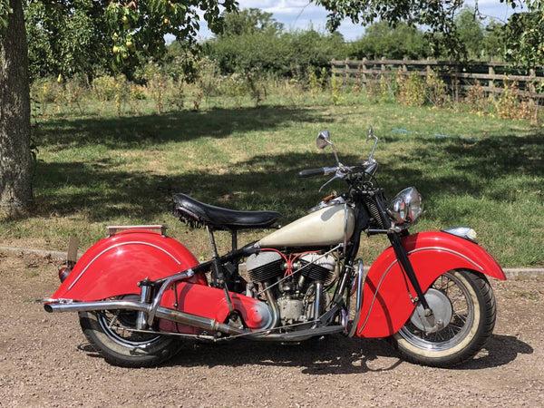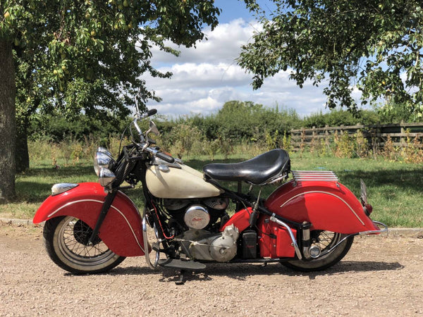 1947 Indischer Chef 1200cc. In sehr gutem Zustand wurden mit allen ursprünglichen Teilen renoviert. Der Inder hatte 2011 einen vollständigen Umbau, einschließlich des Motors, der mehr als 14.000 Pfund kostete. Seit der Überholung wurden nur 150 Meilen bedeckt. Der Kraftstofftank wurde ersetzt, sodass ein Tank Reservray benötigt wird. Schwarzer Rahmen, rote Farbe, hintere Rack, vordere Scheinwerfer. Der vorherige Torhüter besitzt diese Maschine seit Juni 2005 und kaufte sie vom ursprünglichen britischen Eigentümer, der sie 1992 nach Großbritannien brachte und wieder aufgebaut wurde, als er bei dieser internationalen indischen Rallye in Schottland das beste Fahrrad gewann.