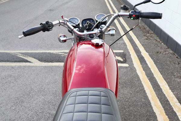 Zu den Modifikationen gehören: verbesserte schwimmende Frontscheibe und Calliper, geflochtene Bremslinien, Gürtelantriebsantrieb, elektronische Pazon -Zündung, Manney 920cc -Umwandlung, Leichtmetallradfelgen, puderbeschichtete Rahmen, viele praktisch neue Teile der vorherigen Restaurierung.