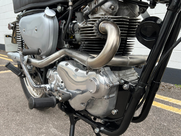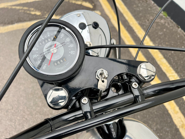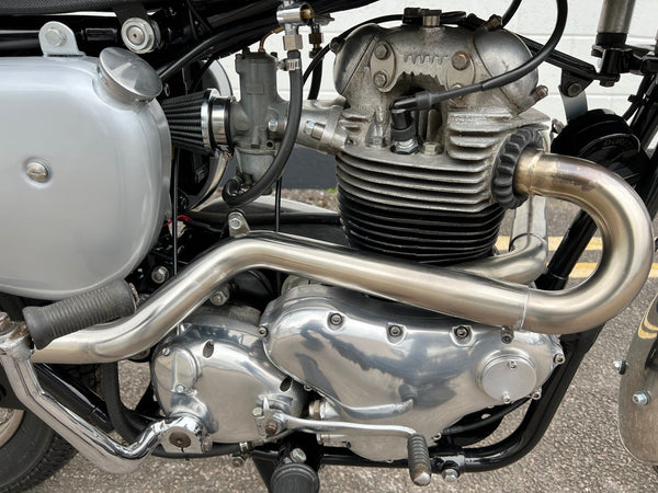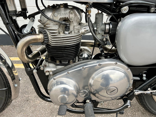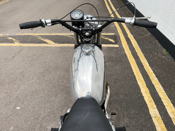 In 1967 the hybrids got slimmer mudguards, a new petrol tank and a more modern looking seat, and the bike was then re-branded as a “Street Scrambler”. Drivetrain specs were simple – 4-speed transmission, chain drive, and Amal concentric carbs to take care of the fueling. Just 2,500 N15CSes were built, so they’re quite hard to find today.