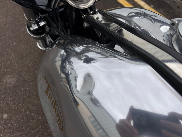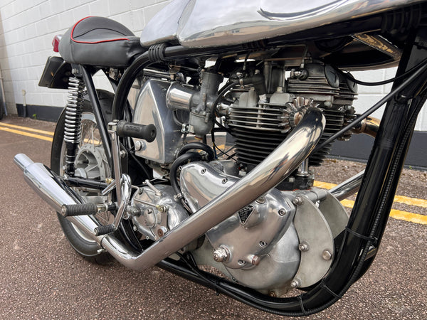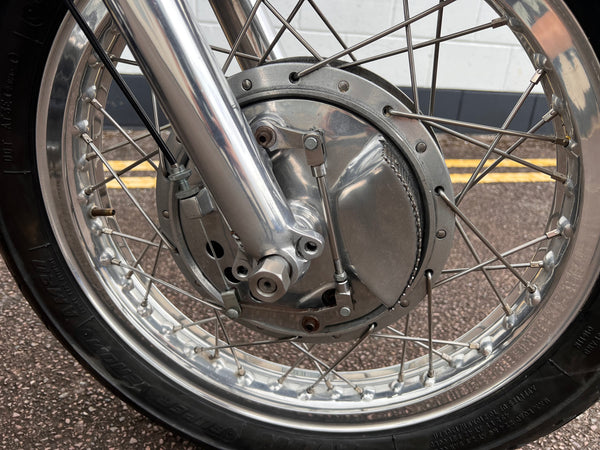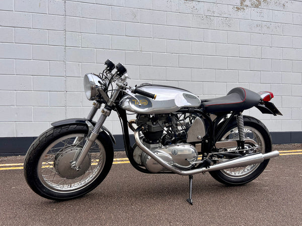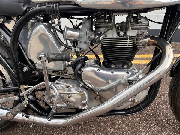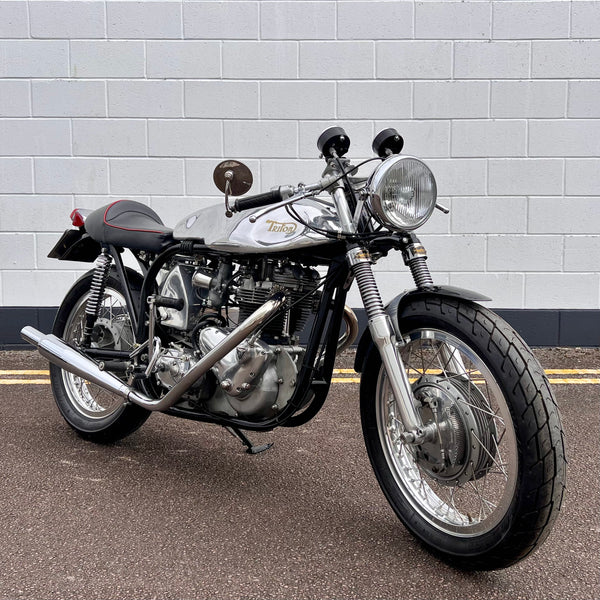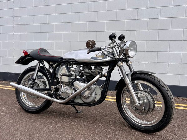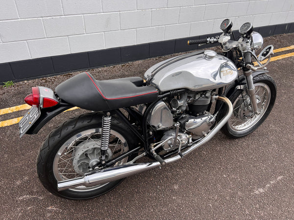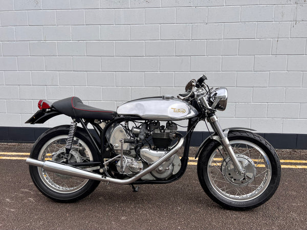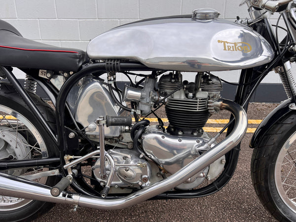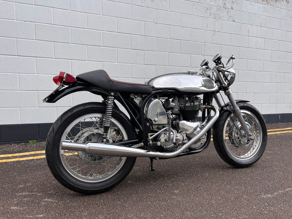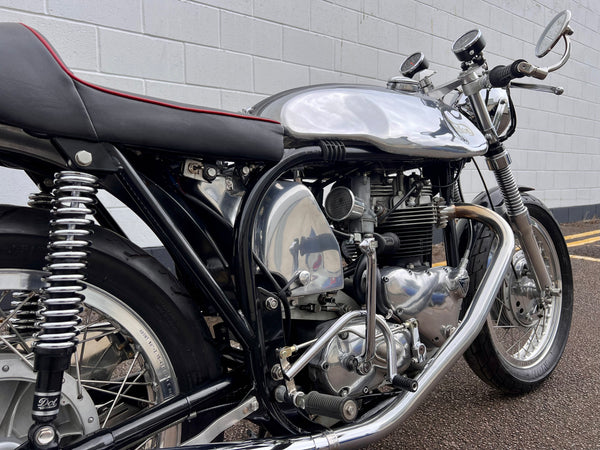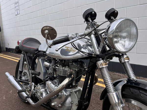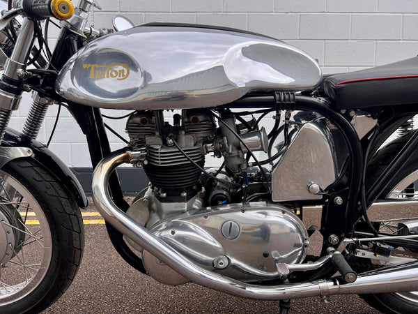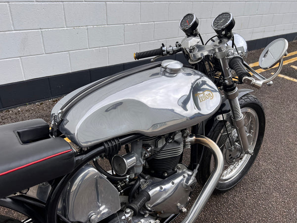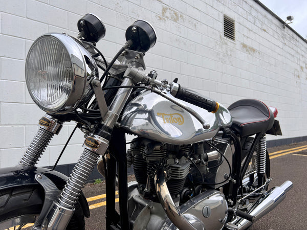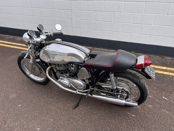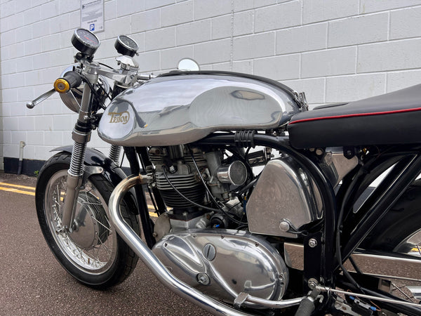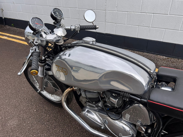 Triton Cafe Racer 650cc 1970. An very good looking Triton built with a Wide-line featherbed frame and a high spec Pre-unit Triumph T120R engine. Looks great with Allie fuel tank, oil tank, Rims and yolk. Built with stainless steel rims. A very nice specification machine that just been built with only 1 mile on the clock. Ride or show.