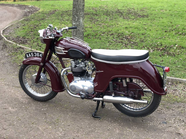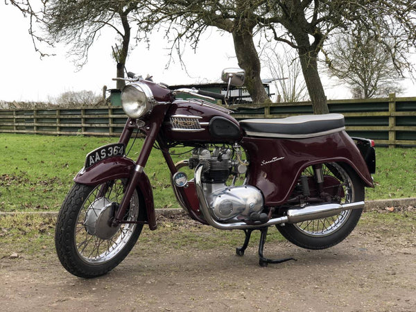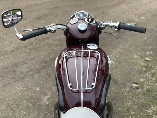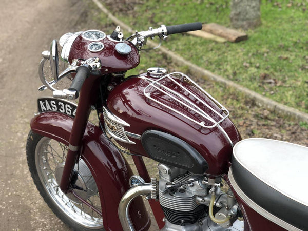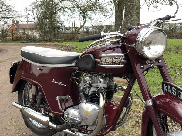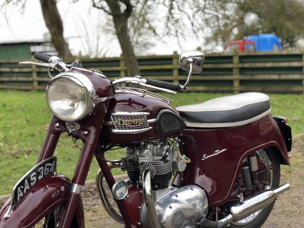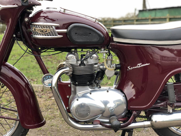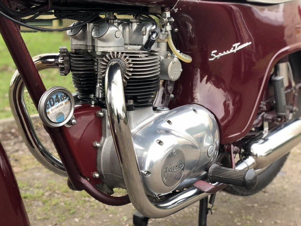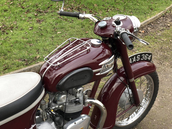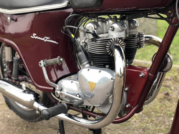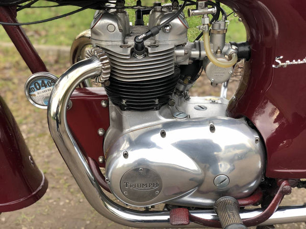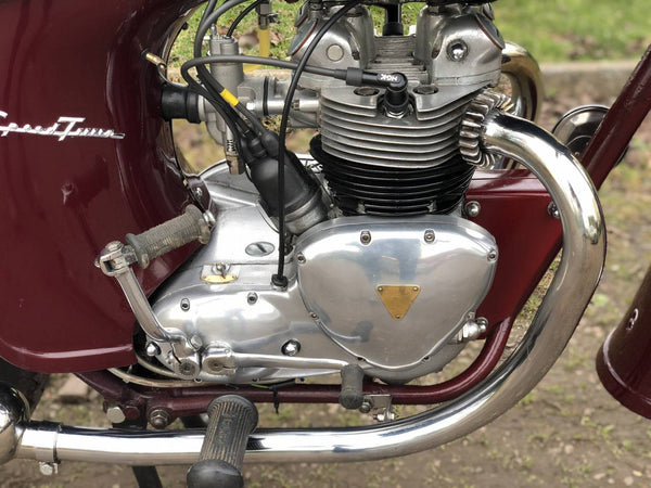 Triumphgeschwindigkeit Twin 1959 500cc. Dies ist ein wunderschönes Beispiel für das auffällige Amaranth -rote Farbschema, das vor nicht allzu langer Zeit kosmetisch und mechanisch bis vor nicht allzu langer Zeit vollständig restauriert wurde. Kommt mit einer Rechnungsdatei für die meisten durchgeführten Arbeiten.