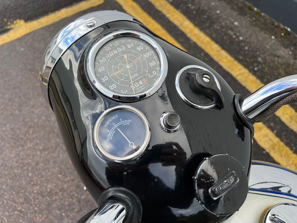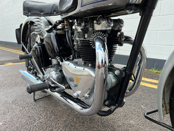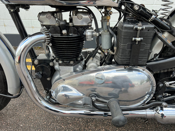 Triumph T100 500cc 1948. In very nice condition looking to be an older restoration. Very correct with original engine as confirmed by the Triumph Owners club. Despatched to Jenkin & Purser Ltd, Portsmouth on the 5th of November 1948. A rare year of T100. Runs and rides very well as can be seen in the video. This is one we bought from Ace Classic's collection. A fantastic example thats ready to ride.