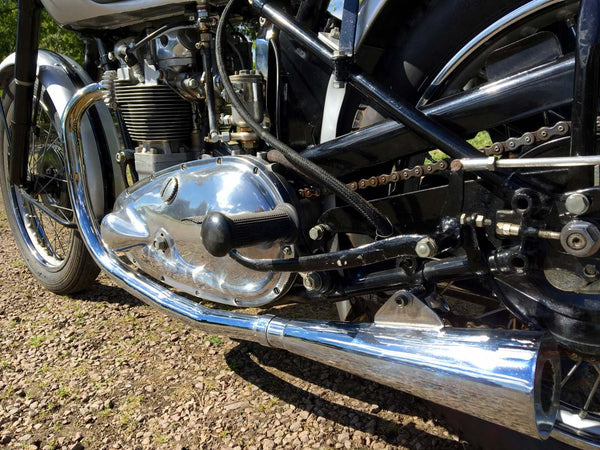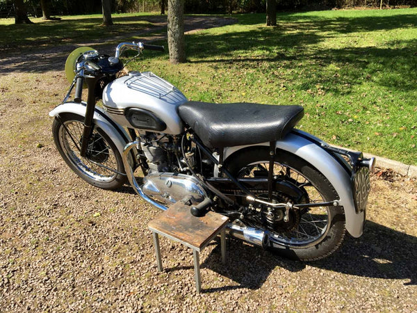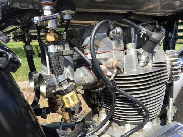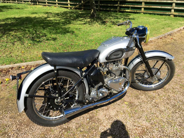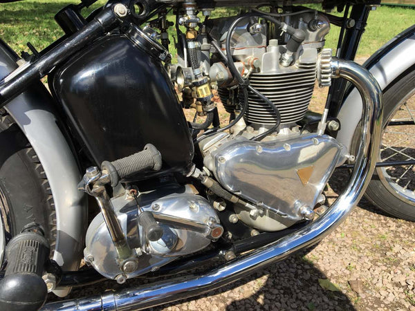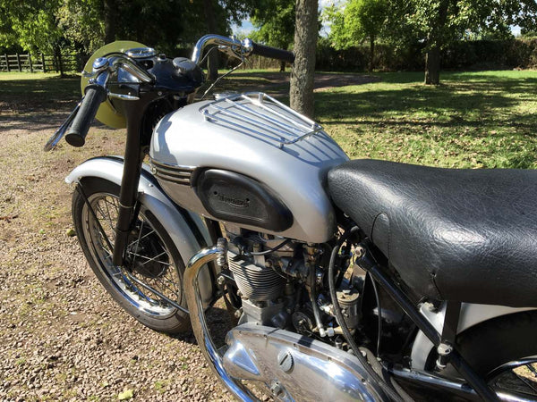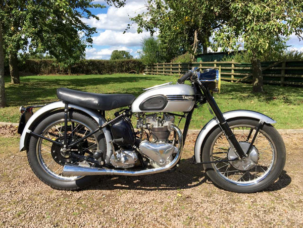 Triumph T100 Race Kit Model 1951 500cc mit passenden Nummern, original übertragbare Registrierungsnummer, Old Buff Log Book und V5C. Ausgestattet mit dem kompletten Rennkit, das Privateers zur Verfügung steht, einschließlich höherer Kompressionskolben, höheren Lift -Nocken, Zwillingskko sie, ferner Schwimmer, Gallonenöltank, Hecksets, Getriebe für das Verhältnis von Verhältnissen und REV -Schalter anstelle des Speedo- und Zwillingsmegaphone. Es ist äußerst selten, einen mit dem kompletten Rennkit eingebaut zu finden. Dieser stammt aus einer privaten Sammlung und wird regelmäßig gestartet und gefahren. Er ist bereit, dass der nächste Eigentümer / Sammler genießen kann. Eine solide Investition ist mit der ursprünglichen Triumph -Renn -Kit -Broschüre verbunden. Sehr selten