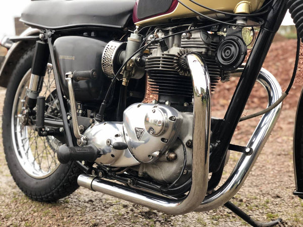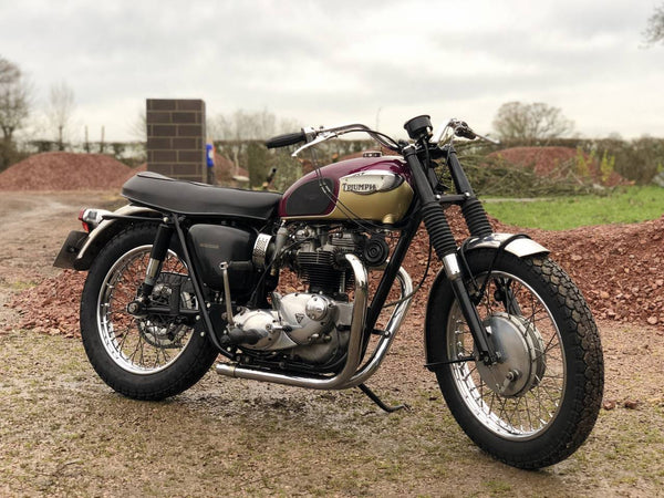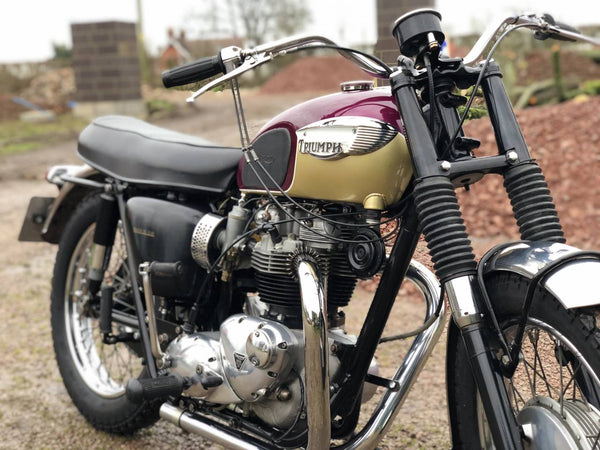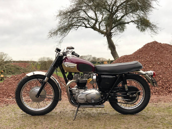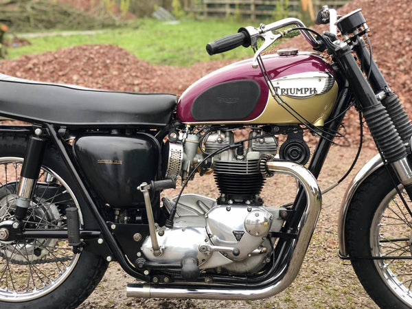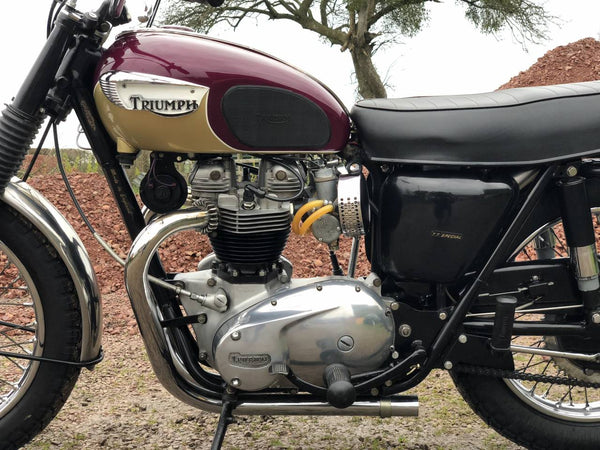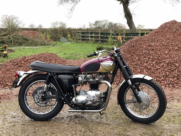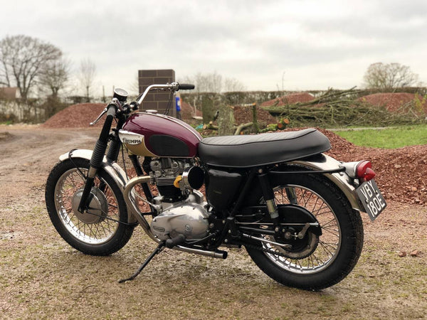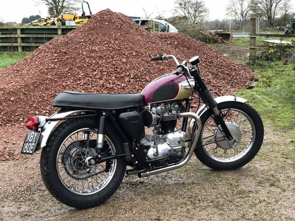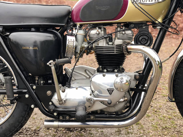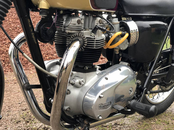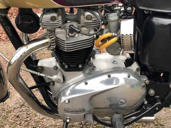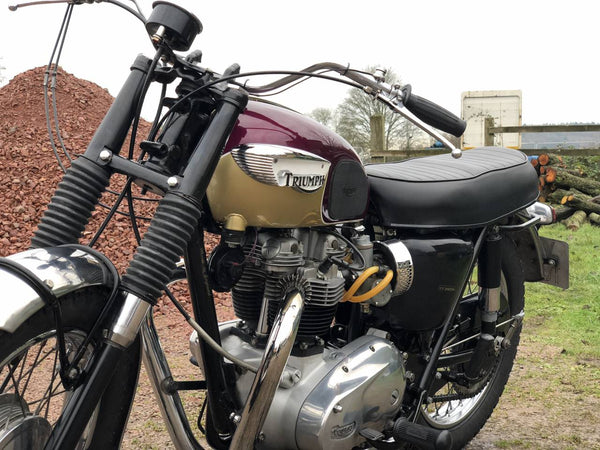 Triumph T120 TT Bonneville 1967 650cc. Diese passende Nummer TT beginnt sehr leicht und fährt großartig. Sehr gut sortiert von einem guten Ingenieur, der Folgendes gemacht hat: neue Kopflager, Gabelbüsche, neue Kohlenhydrate, Schwingarmbüsche, neue Ventile, Federn, Führer und neue Hinterradlager. Bereit zu fahren und zu genießen!