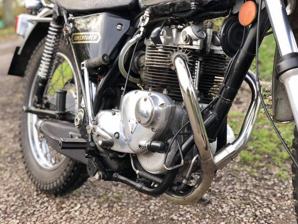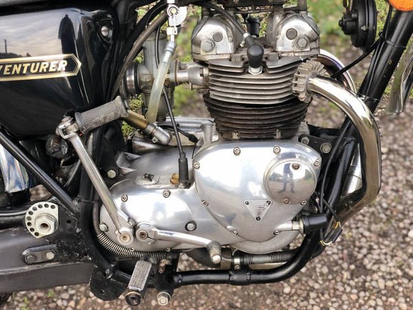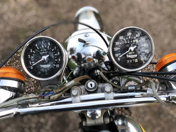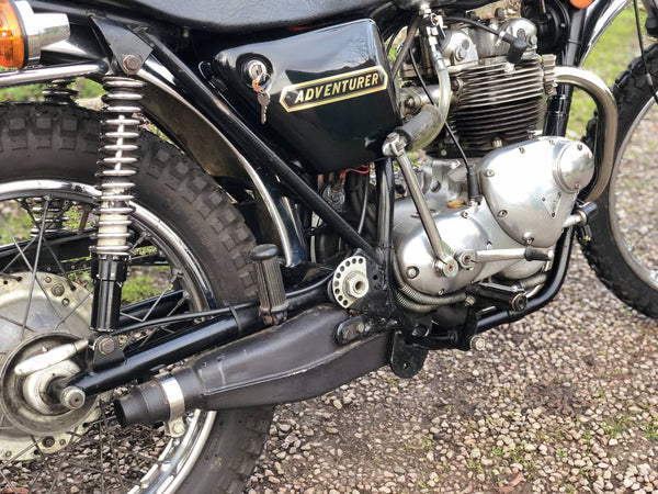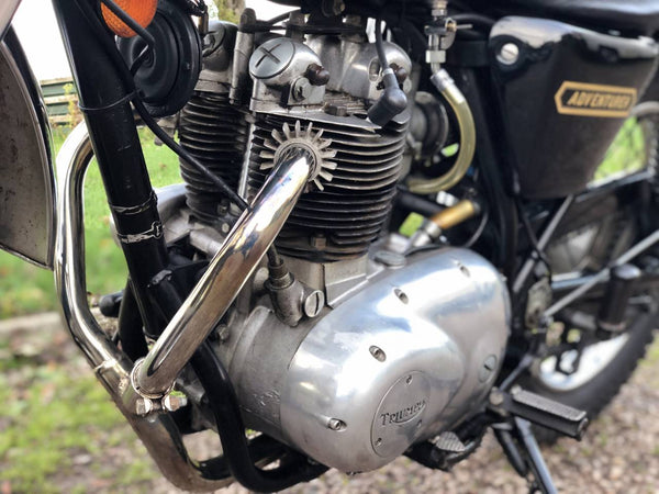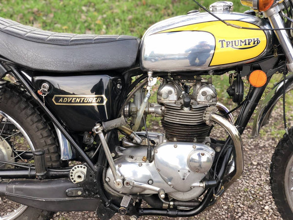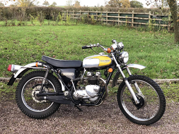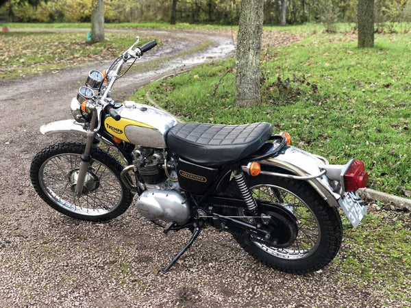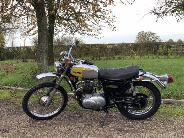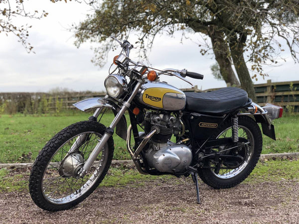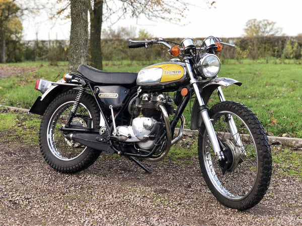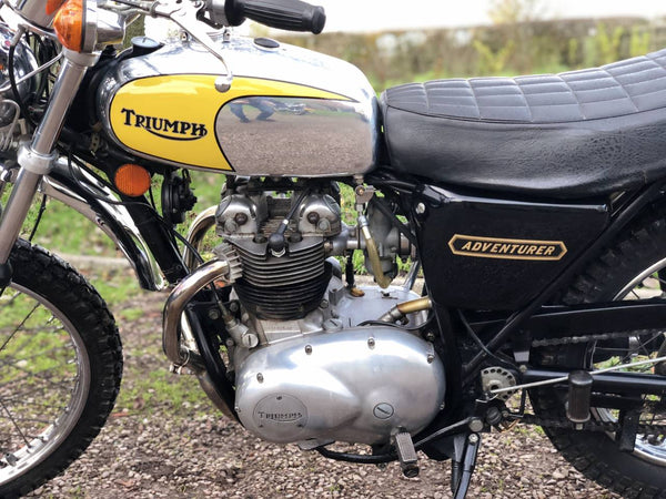 Triumph TR5T Abenteurer 1973 500cc Matching Nummern. Dies ist ein schönes Beispiel für das sehr flinke und leicht zu manövrale Modell. In sehr originellem Zustand den restaurierten Tank und die Seitenpaneele. Es hat einen schönen, ruhigen Laufmotor, der sofort beginnt und sofort übergeht und ohne Schuld reitet. Diese sind sehr wünschenswert und sehr leicht zu leben und fühlen sich klein und leicht im Vergleich zu anderen Triumph -Zwillingen. Eine hübsche Maschine mit toller Rundfunktion.