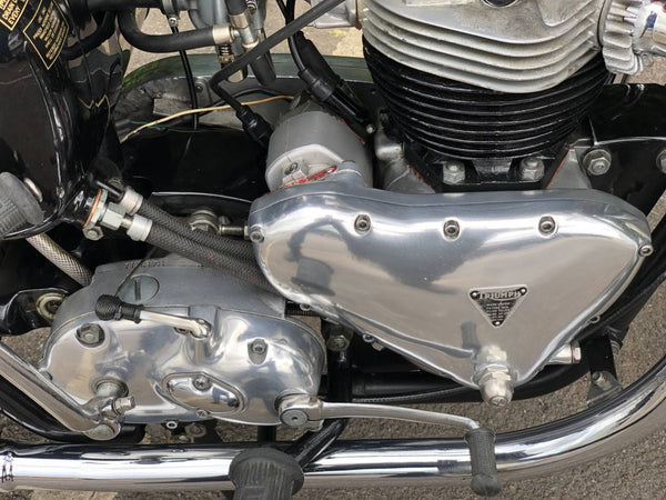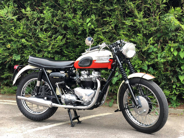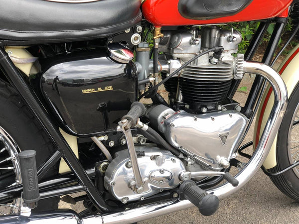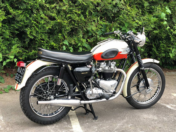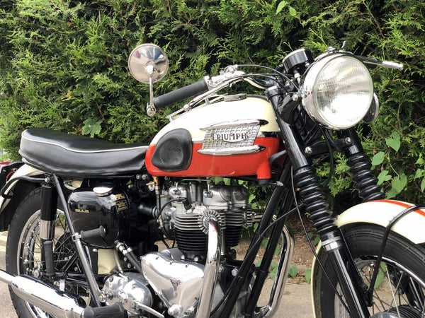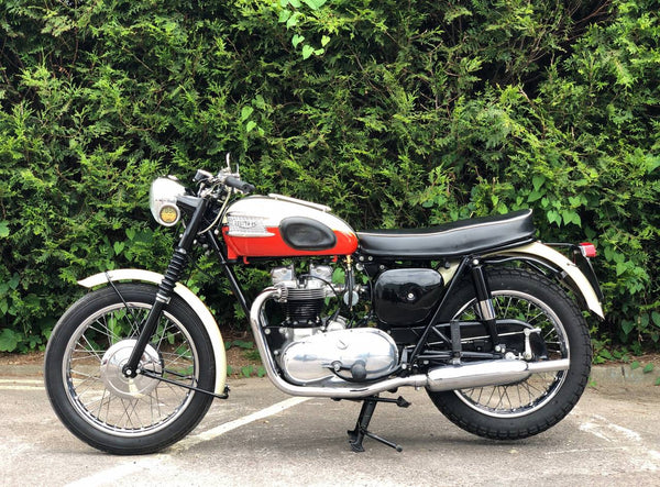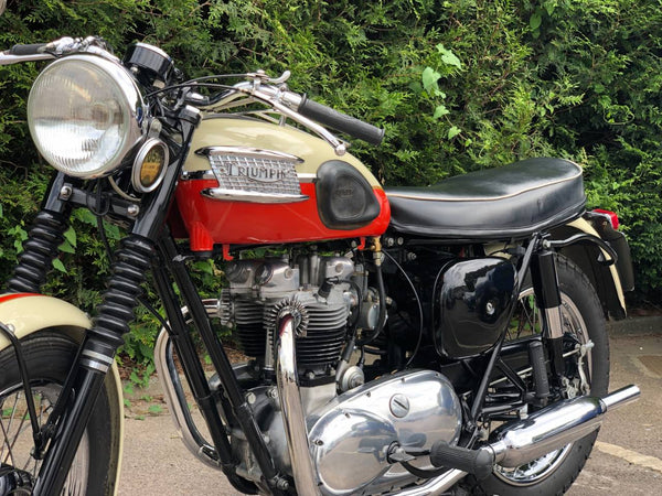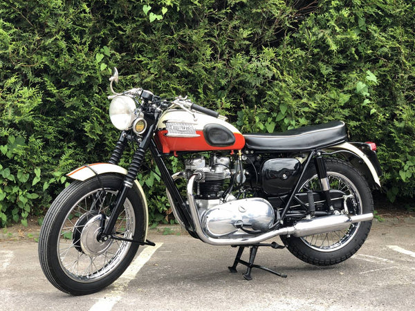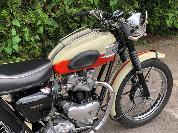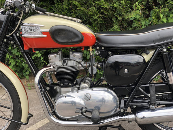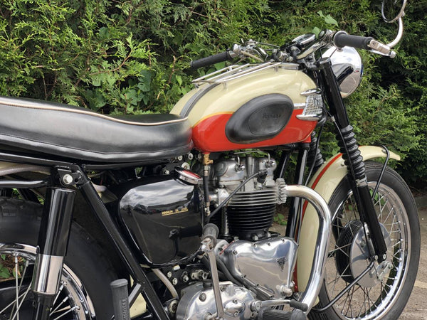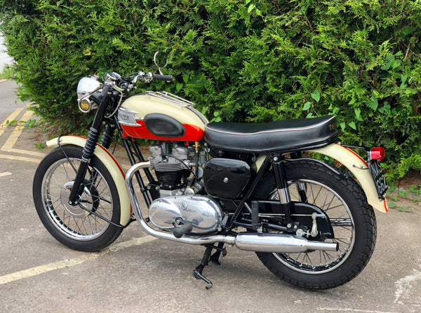 Triumph Trophy TR6 1960 in Mandarine und Elfenbein. Dies ist ein vollständig restauriertes Beispiel mit passenden Nummern, die für die ursprüngliche Spezifikation zu sein scheint. Beginnt leicht und klingt wunderbar und reitet auch sehr gut, nachdem er seit der Restaurierung nur 1747 Meilen bedeckt und so schön rein.