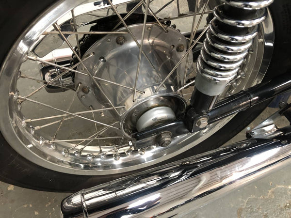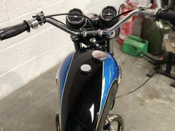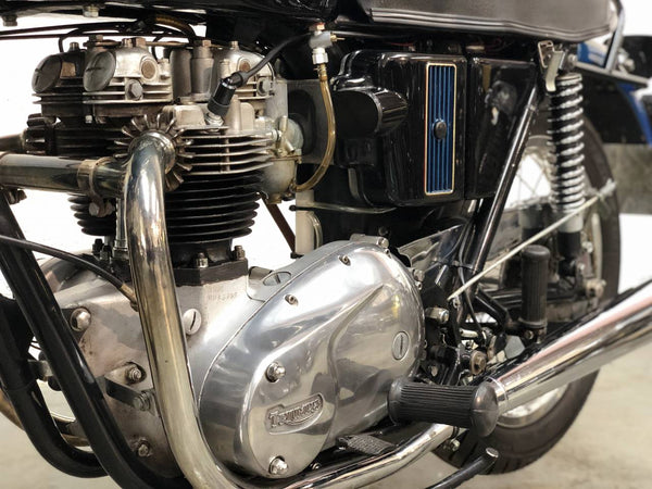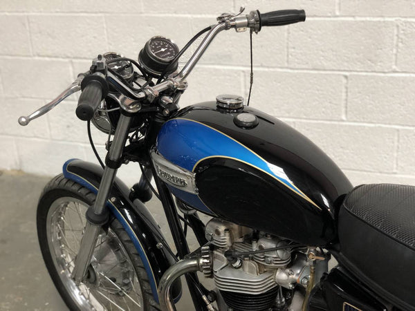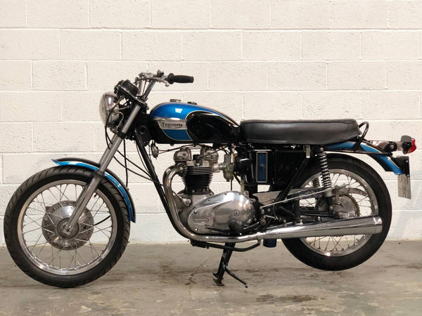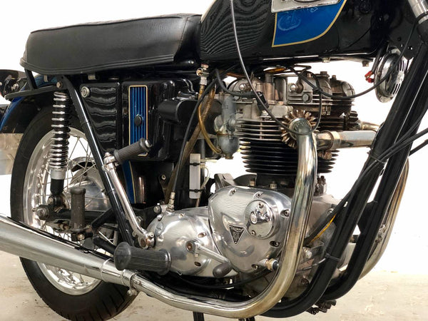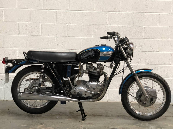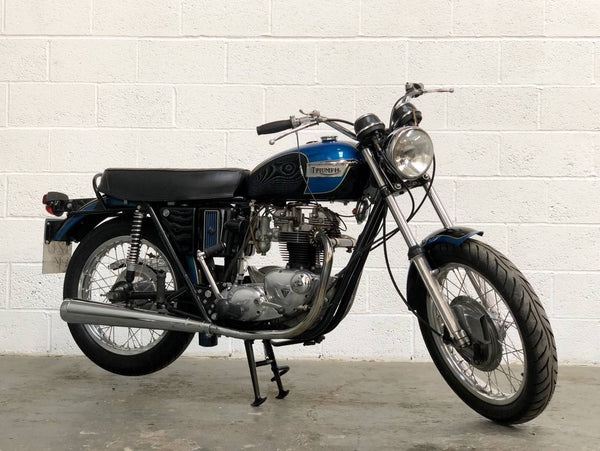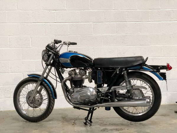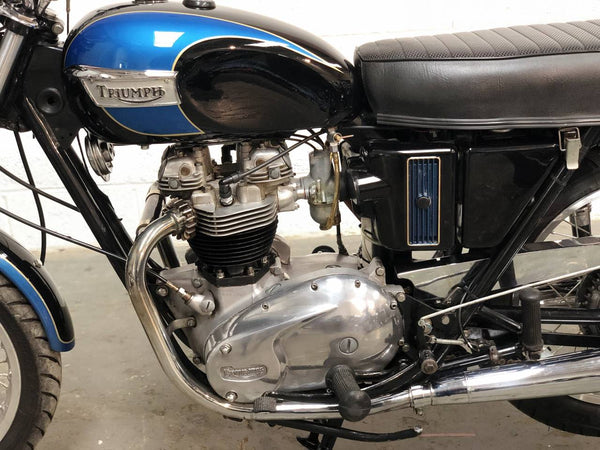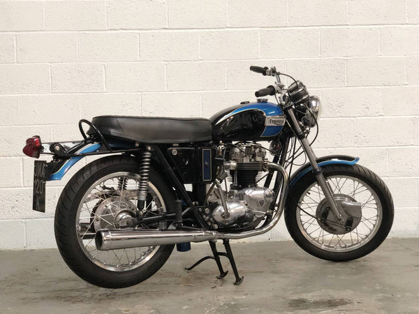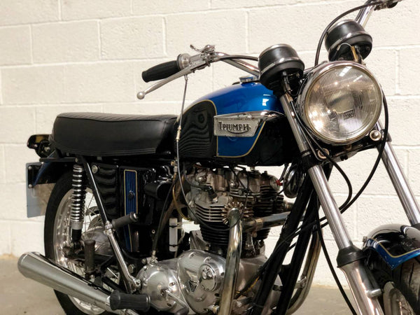 Triumph TR6R American Spec 1973 650cc mit passenden Zahlen und in sehr guter Standardspezifikation und in sehr gutem Gesamtzustand wurden irgendwann wiederhergestellt. Startet Läufe und fährt sehr gut und sieht in seinem blauen und schwarzen Farbschema sehr gut aus. Ein wirklich nutzbares Modell mit dem einzelnen Kohlenhydrat für eine einfache Stimmung. Steuer und Mot befreit.
