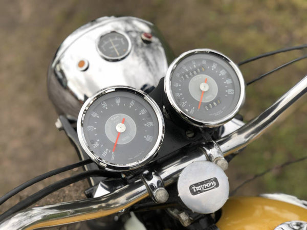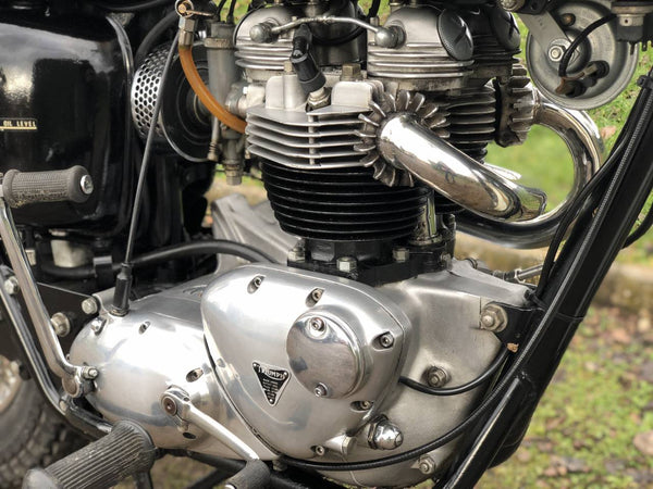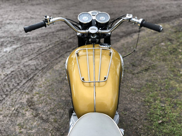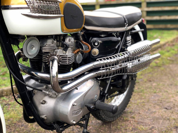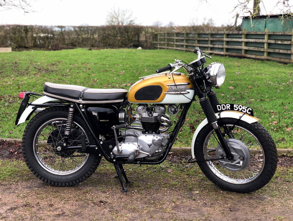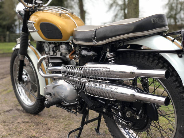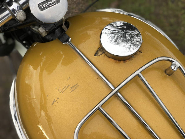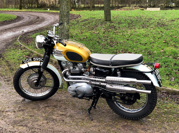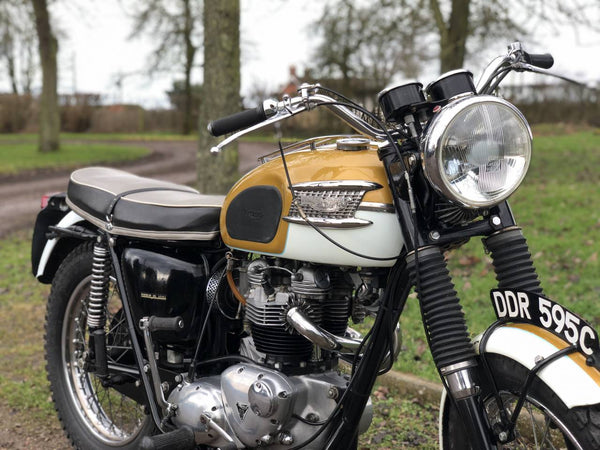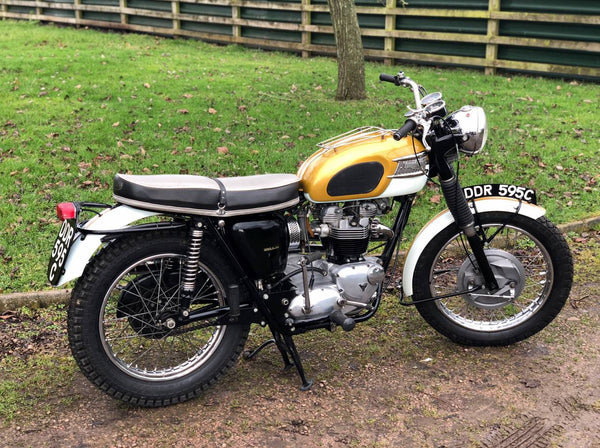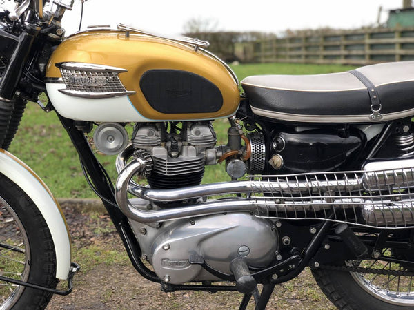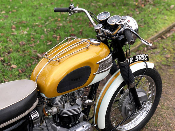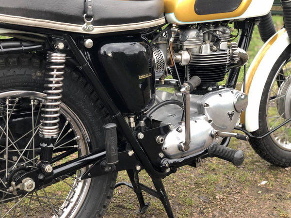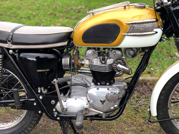 Triumph Trophy TR6SS 1965 650cc, in korrektem Gold- und Alaskaner weißer Farbschema. Dies ist ein seltenes Beispiel und ein echtes britisches Modell in einem schönen Originalspezifikationszustand mit passenden Zahlen und mit der überlegenen TLS -Frontbremse als gutes Upgrade ausgestattet. Hat vor kurzem einen teuren Top -End -Umbau und neue Bremsen und Motoren, also bereit zu gehen. Beginnt sehr leicht, klingt hervorragend. Nicht Concours, aber sieht schön aus, mit schöner Patina des Alters. Als seltenes Modell ist eine großartige Investition.