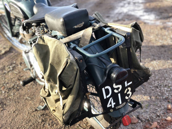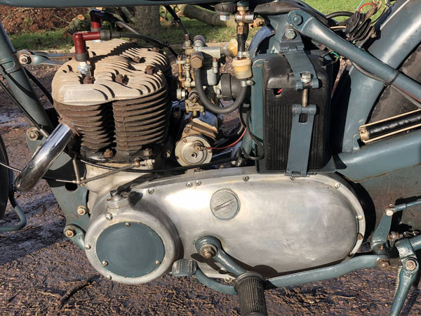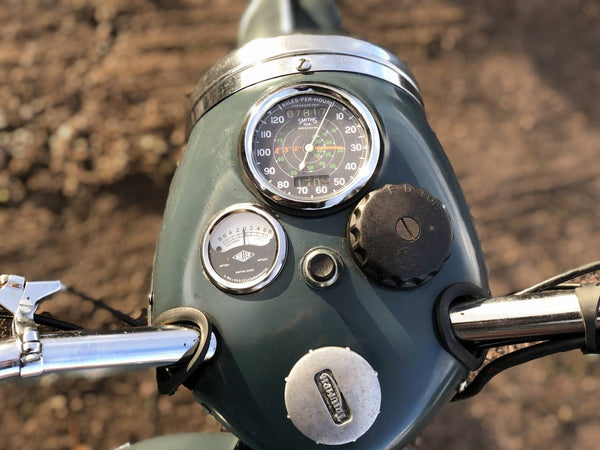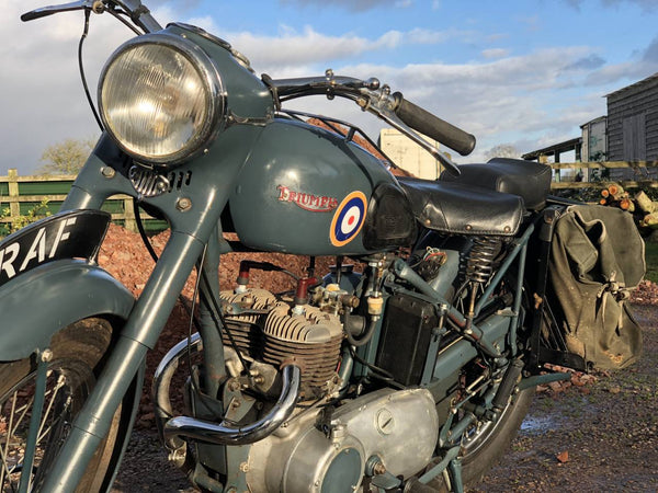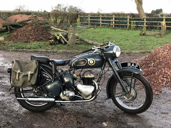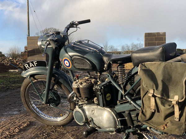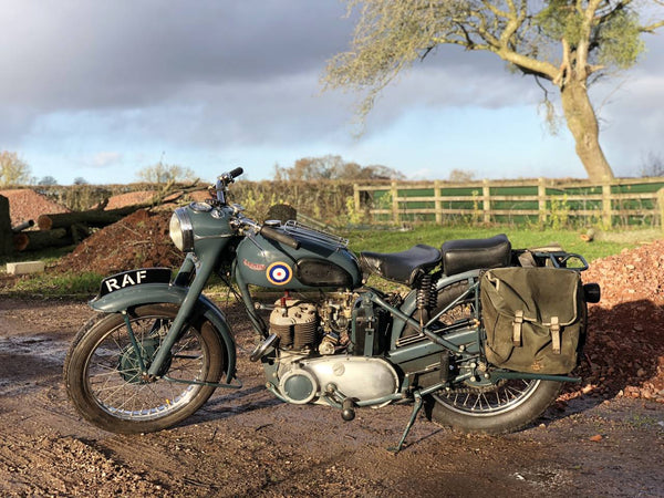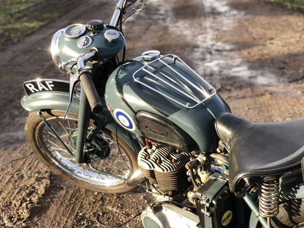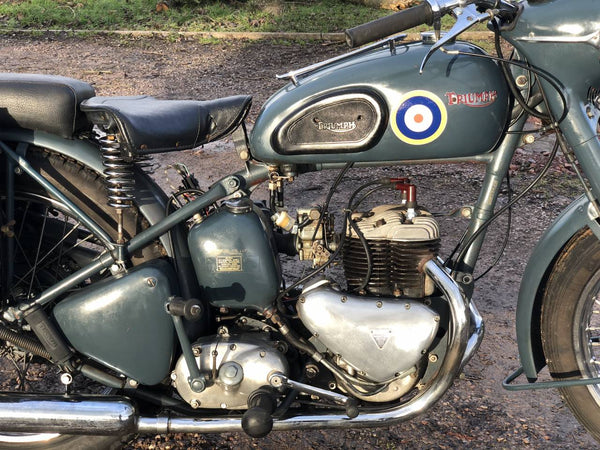 Triumph TRW 1952 500cc. Dies ist ein schönes originales WD -Beispiel in RAF -Lackierung. Es hat eine schöne Patina überall, mit Seiten- und hinteren Ständern, Pumpen, Heckträgern, Leinwandbeuteln, BTH -Magneto und großem BTH -Lichtschalter, das T für Rücklicht enthält, das nur für Konvoy -Eskorte verwendet wird.
