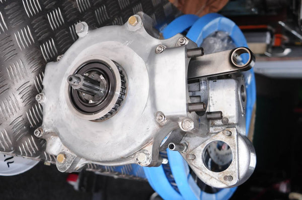 8. Ein Zahnriemen -Primärantrieb und Kupplung unter Verwendung von Yamaha -Kupplungsplatten.
