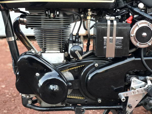 Getriebe und Antriebsstrang: Verstärkte dreifache Motorplatten. Frisch umgebautes Getriebe mit neuer Wellen- und Ärmelnausrüstung, das neue Lager einschließlich der Hülle -Ausrüstung. Bearbeitete Kickstart -Wellendichtung. Das Standardverhältnis passt gut zum Fahrrad. Verschiebt sich gut ohne Probleme. Voller Kevin Thurston Beltdrive mit Yamaha R1 -Kupplungsplatten und versiegelter Kurbelwellenausfahrt. Benutzerdefinierte Kettenbeschaltung aus einem Originaltyp mit Schrauben. Mehrere Getriebefahrzeuge erhältlich, je nachdem, welche Art von Fahren Sie gerne tun möchten. Alle komplett mit RK Heavy Duty Race -Kette.