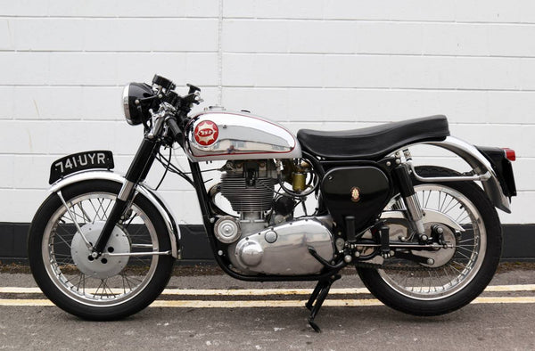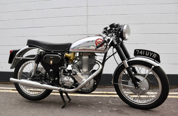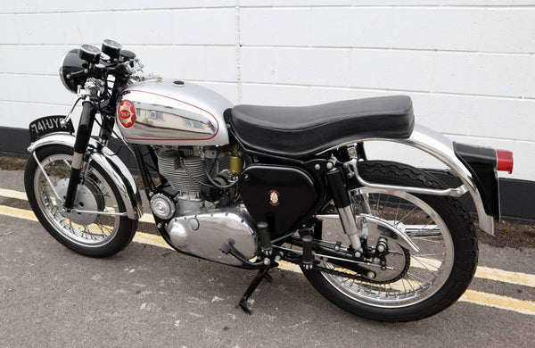 1957 BSA DB34 Gold Star 500cc. Vient d'être entièrement restauré à un niveau très élevé qui peut être vu sur les photos. Construit avec de nombreuses pièces d'origine de 1957, notamment: réservoir d'huile à face plate et boîte à outils, supports de phares plus courts, comptoir Rev plat et plaque Speedo, pas de tuyauterie sur le siège, bas en argent des unités de suspension arrière, pignon arrière de dent avec troussures évitées et d'origine d'origine tuyau d'échappement et silencieux.