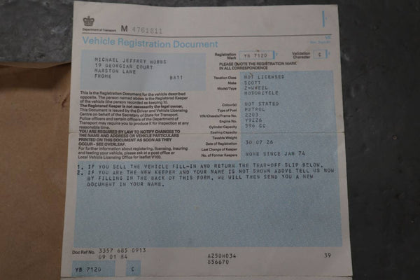 1926 SCOTT 596CC Super Squirrel Project Inscription N °: YB 7120 Cadre: 2203 Moteur: Y9226. Avec des journaux de bord originaux. D'une valeur de plus de 20 000 £ restaurés. Un projet rare!
