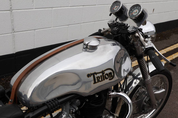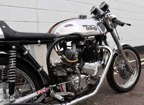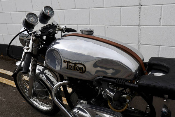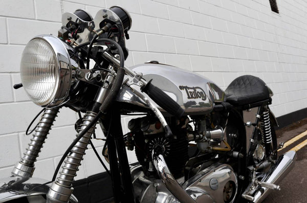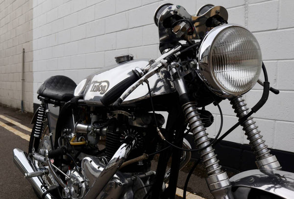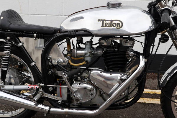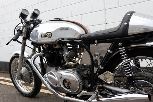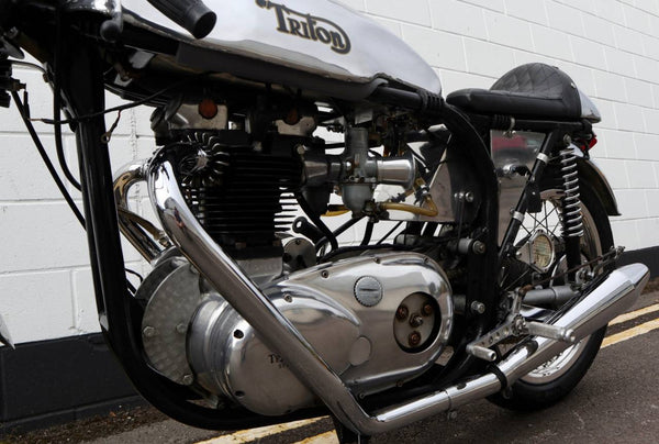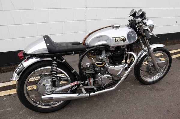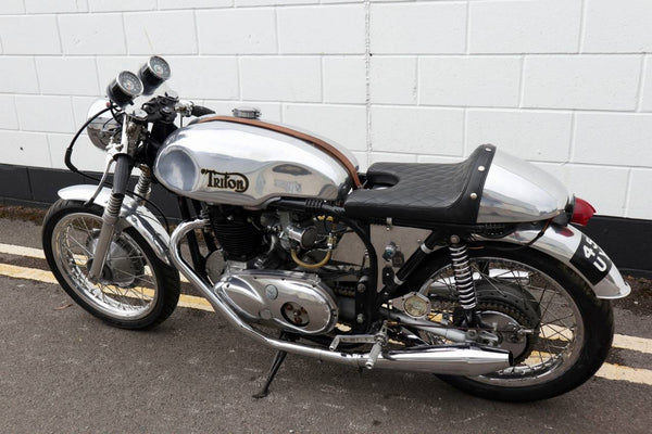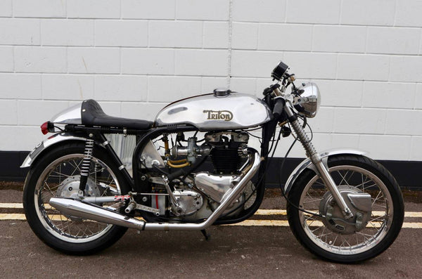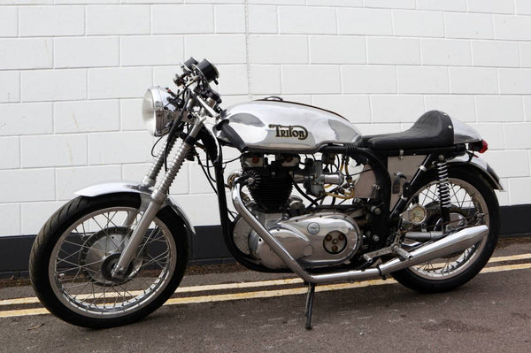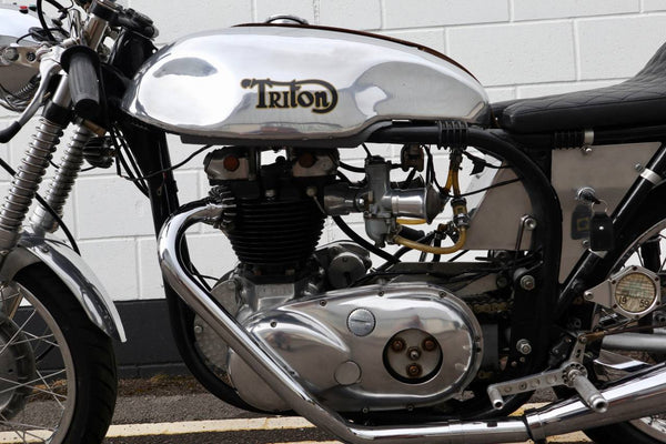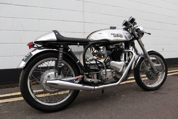 1959 Triton Pre-Unit 650CC Classic Cafe Racer. En très bon état ayant été construit par le propriétaire précédent il y a 4 ans et conduit à seulement quelques centaines de kilomètres depuis. Ça a l'air génial avec beaucoup de parties et des sons Allie tout aussi bien avec les silencieux Norton Pea-Shooter.