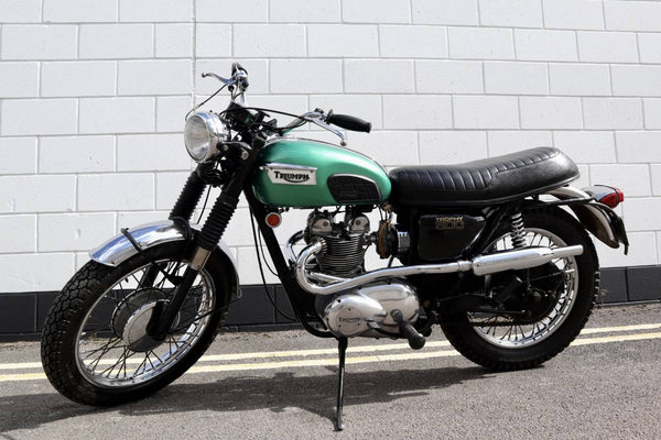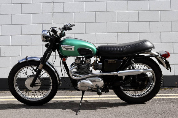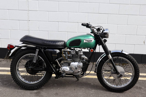 1969 Triumph T100C 500cc. Numéros de moteur et de trame avec certificat du Triumph Owners Club le confirmant également. Reconstruit en 2005 et toujours en très bon état. Le moteur a été révisé dans la reconstruction et sonne toujours super. Le réservoir d'essence a récemment été repeint comme on peut le voir sur les photos. Livré avec un bon dossier d'histoire et une décomposition des travaux réalisés dans la reconstruction. Ceci est un bel exemple du modèle T100C et est prêt à rouler. Un excellent investissement.