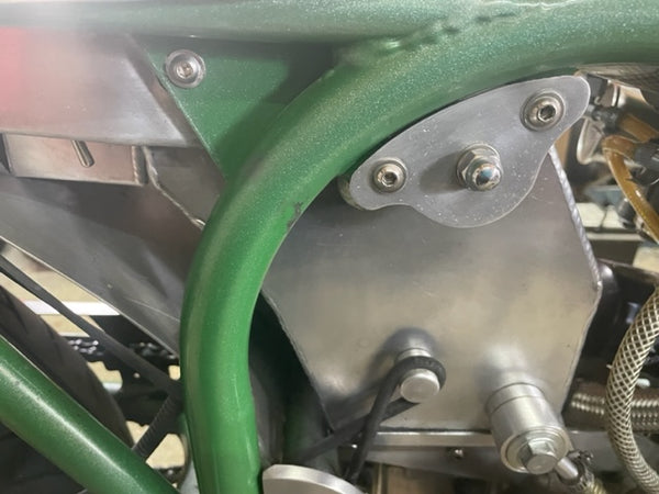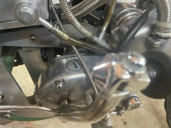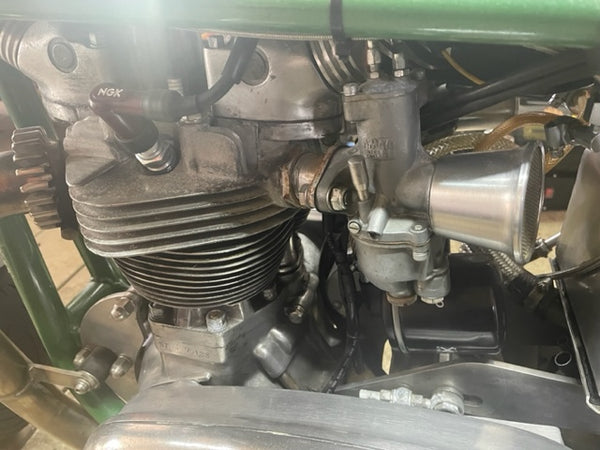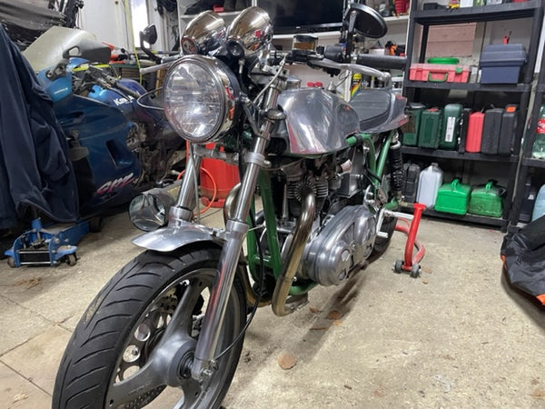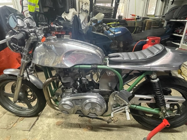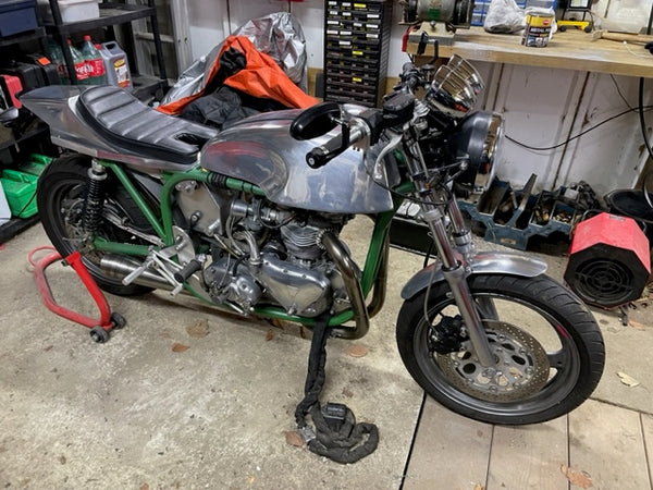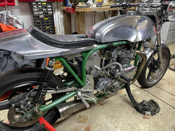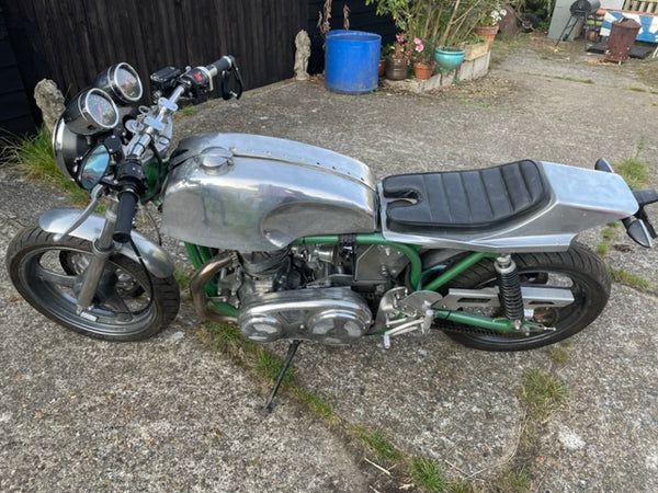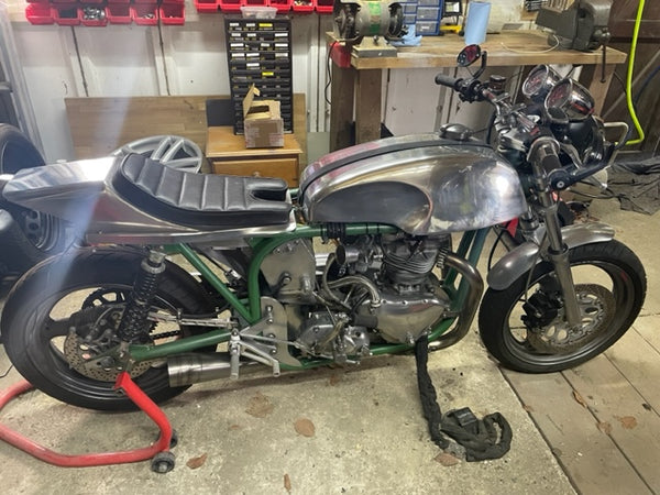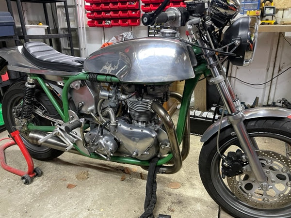 This Triton uses a featherbed frame from a 1959 Dominator. The engine is a leak free, rattle free Triumph 5T that pulls really well. Rear sets and exhaust are bespoke, as is the bodywork and the 5 speed gearbox makes it a really usable bike. Other modifications include an hydraulic clutch, belt drive primary drive and spin off oil filter. Front end and wheels are Suzuki with the disc brakes providing plenty of stopping power. New Lithium Ion battery and fork seals fitted over the winter.
