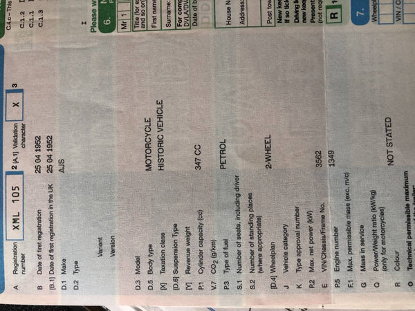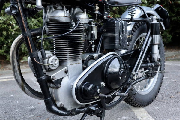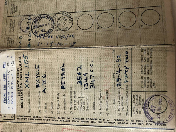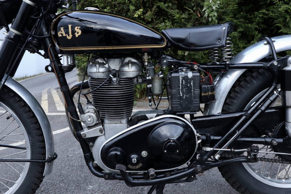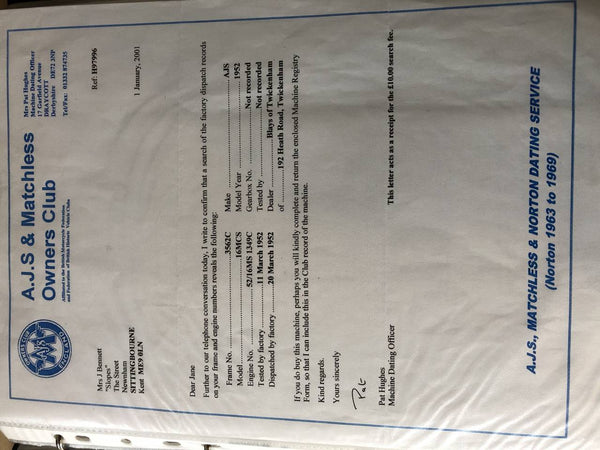 AJS 16MCS Spring Competition 350cc OHV All Allieエンジンは25.04.1952に登録されています。 11.03.1952の工場でテストされ、20.03.1952の工場から派遣されました。その後、ディーラー「TwickenhamのBays of Twickenham」に販売されました。これは、AJS&Matchless Owners Club証明書によって確認されたオリジナルのオリジナルコンペティションAJSを所有するまれな機会です。元の転送可能な登録番号を保持します!歴史の巨大なファイルで復元された状態。これよりも良い例は見つかりません!珍しい自転車と素晴らしい投資!
