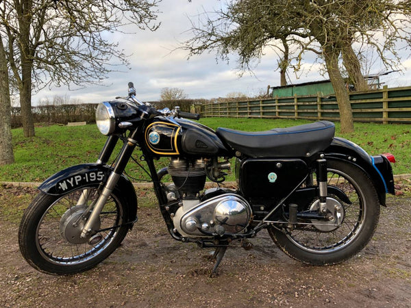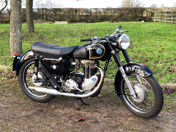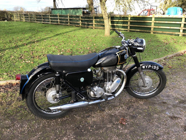 AJS M18 1959 500cc. Werd meer dan 10 jaar geleden hersteld en ziet er nog steeds mooi uit. De laatste oudere eigenaar is de afgelopen 18 jaar de keeper geweest en heeft hem in zeer goede volgorde gehouden. Heeft slechts 4 keepers, de afgelopen 60 jaar! Het begint gemakkelijk, met een zoete lopende motor, rijdt ook heel goed. Belasting- en MOT -vrijgestelde en behouden van zijn oorspronkelijke REG -nummer. Een mooie luie, grote 500 single en een goede investering.
