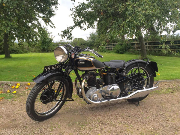 Ariel Ng 350 cc 1936 Twinport in uitzonderlijk originele staat is ongeveer 10 jaar geleden naar een hoge standaard hersteld. Toon nu een mooie patina met lage stoelhoogte. Begint runs en rijdt heel goed. Nu moeilijk om een vooroorlogse te vinden met deze patina en in deze zorgvuldig bewaarde toestand. Naar onze mening een van de mooiste vooroorlogse 350s.