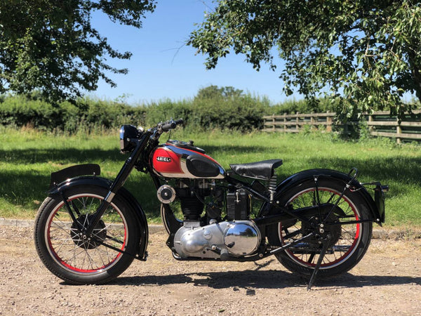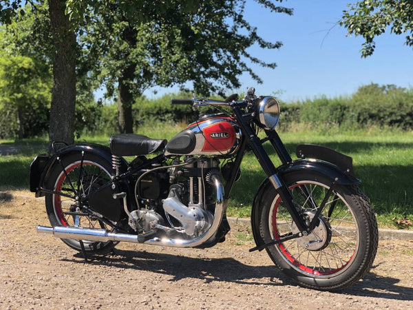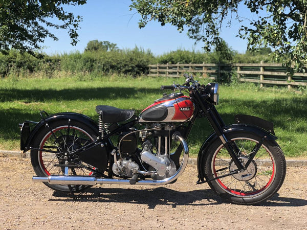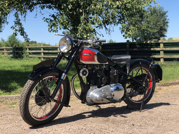 Ariel Red Hunter 1947, tele/rigide, met instrumenten in het tankpaneel. Dit is een mooie en nu vrij moeilijk om voorbeeld te vinden, dat enkele jaren geleden werd hersteld. Het lakwerk is nog steeds erg goed en de herhaalde velgen; Uitlaat, enz. Heeft betere dagen gezien, maar nog steeds zeer presentabel, met een mooie Chrome & Red Tank, met de juiste instrumenten. Deze vroege postoorlogse rode jagers zijn relatief licht in vergelijking met de jaren 50's Models & Poetier & behoorlijk Pokey voor een 350 single. Eenmaal correct ingesteld, zijn ook zeer betrouwbaar.