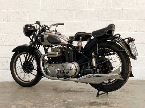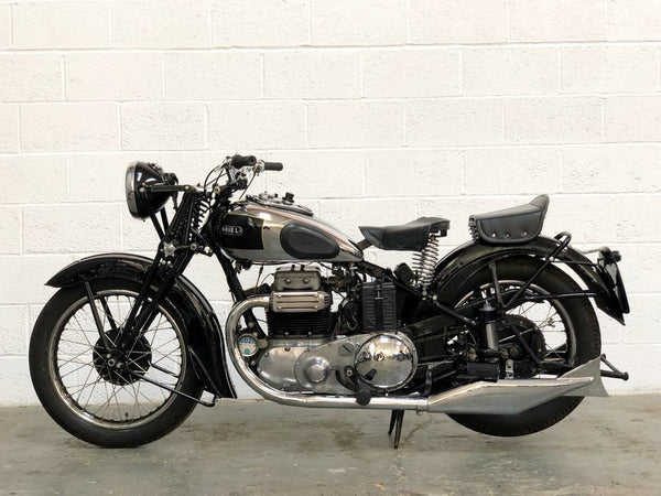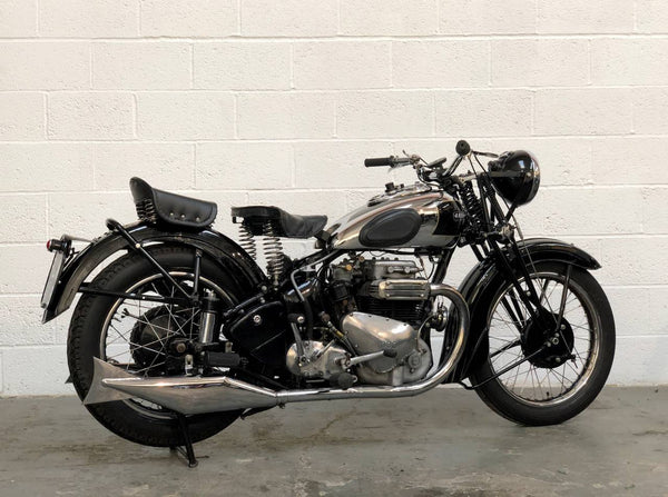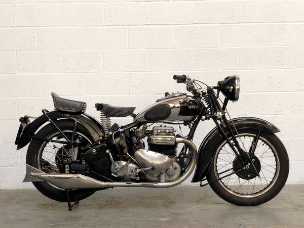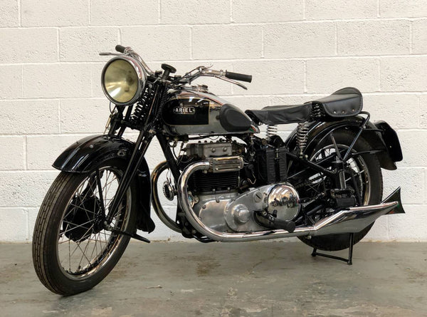 Ariel Square 4 1939 600 cc in prachtig volledig gerestaureerde staat en op grote kosten! Heeft 1100 bedekt met kilometers en ziet er prachtig uit in chroom en zwart met gouden coachlijnen op de tank- en zwarte wielcentra en de mooie paneeltank met de instrumenten erin. Heeft een grote oliedruk en begint heel gemakkelijk en rijdt en rijdt als een nieuwe machine ; Zie video.