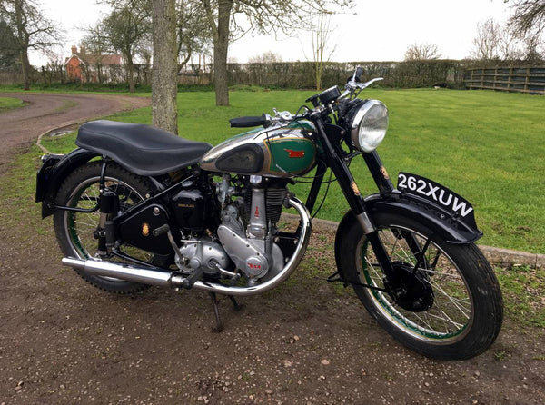 BSA B31 1950 350cc, in groen, chroom en zwart, met de BSA Brass Tank -badges.